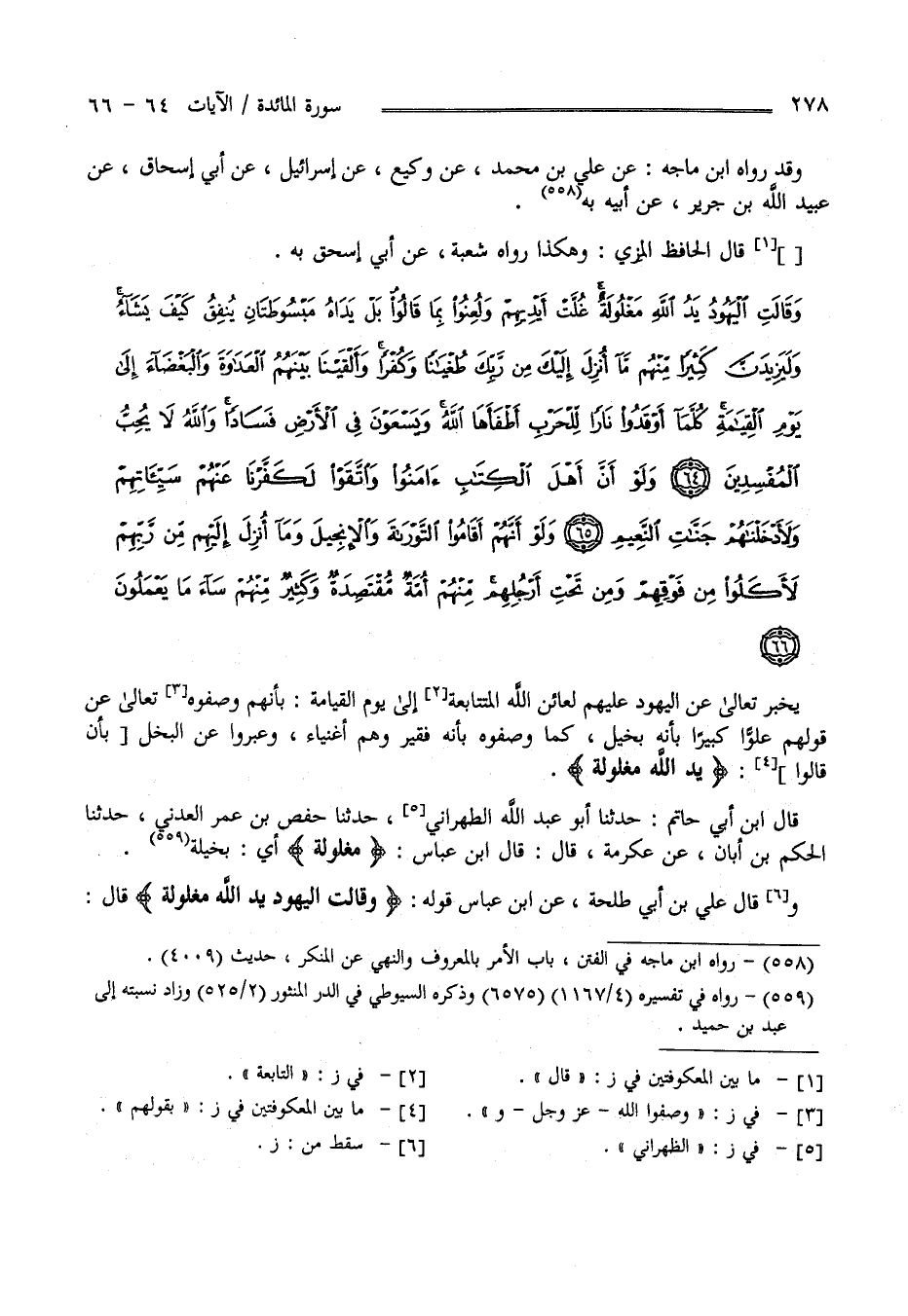 وَقَالَتِ الْيَهُودُ يَدُ اللَّهِ مَغْلُولَةٌ غُلَّتْ أَيْدِيهِمْ وَلُعِنُوا بِمَا قَالُوا بَلْ يَدَاهُ مَبْسُوطَتَانِ يُنْفِقُ كَيْفَ يَشَاءُ وَلَيَزِيدَنَّ كَثِيرًا مِنْهُمْ مَا أُنْزِلَ إِلَيْكَ مِنْ رَبِّكَ طُغْيَانًا وَكُفْرًا وَأَلْقَيْنَا بَيْنَهُمُ الْعَدَاوَةَ وَالْبَغْضَاءَ إِلَى يَوْمِ الْقِيَامَةِ كُلَّمَا أَوْقَدُوا نَارًا لِلْحَرْبِ أَطْفَأَهَا اللَّهُ وَيَسْعَوْنَ فِي الْأَرْضِ فَسَادًا وَاللَّهُ لَا يُحِبُّ الْمُفْسِدِينَ (64)