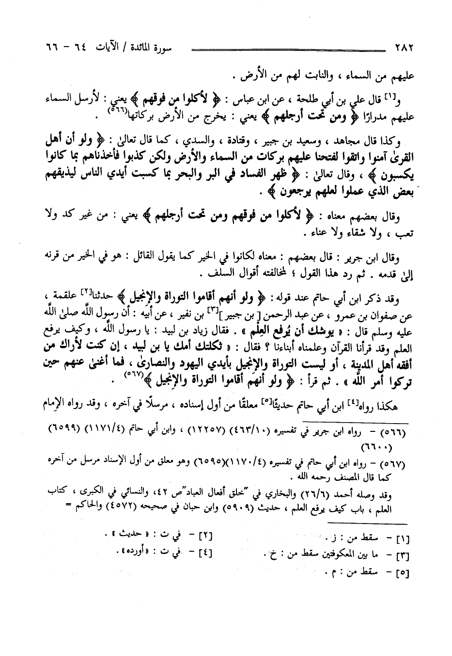 وَقَدْ ذَكَرَ اِبْن أَبِي حَاتِم عِنْد قَوْله " وَلَوْ أَنَّهُمْ أَقَامُوا التَّوْرَاة وَالْإِنْجِيل " فَقَالَ حَدَّثَنَا عَلْقَمَة عَنْ صَفْوَان بْن عَمْرو عَنْ عَبْد الرَّحْمَن بْن جُبَيْر بْن نُفَيْر عَنْ أَبِيهِ أَنَّ رَسُول اللَّه - صَلَّى اللَّه عَلَيْهِ وَسَلَّمَ - قَالَ يُوشِك أَنْ يُرْفَع الْعِلْم قَالَ زِيَاد بْن لَبِيد يَا رَسُول اللَّه وَكَيْف يُرْفَع الْعِلْم وَقَدْ قَرَأْنَا الْقُرْآن وَعَلَّمْنَاهُ أَبْنَاءَنَا فَقَالَ : ثَكِلَتْك أُمُّك يَا اِبْن لَبِيد إِنْ كُنْت لَأَرَاك مِنْ أَفْقَهِ أَهْلِ الْمَدِينَةِ أَوَلَيْسَتْ التَّوْرَاة وَالْإِنْجِيل بِأَيْدِي الْيَهُود وَالنَّصَارَى فَمَا أَغْنَى عَنْهُمْ حِين تَرَكُوا أَمْر اللَّه ثُمَّ قَرَأَ " وَلَوْ أَنَّهُمْ أَقَامُوا التَّوْرَاة وَالْإِنْجِيل" هَكَذَا أَوْرَدَهُ اِبْن أَبِي حَاتِم مُعَلَّقًا مِنْ أَوَّل إِسْنَاده مُرْسَلًا فِي آخِره وَقَدْ رَوَاهُ الْإِمَام