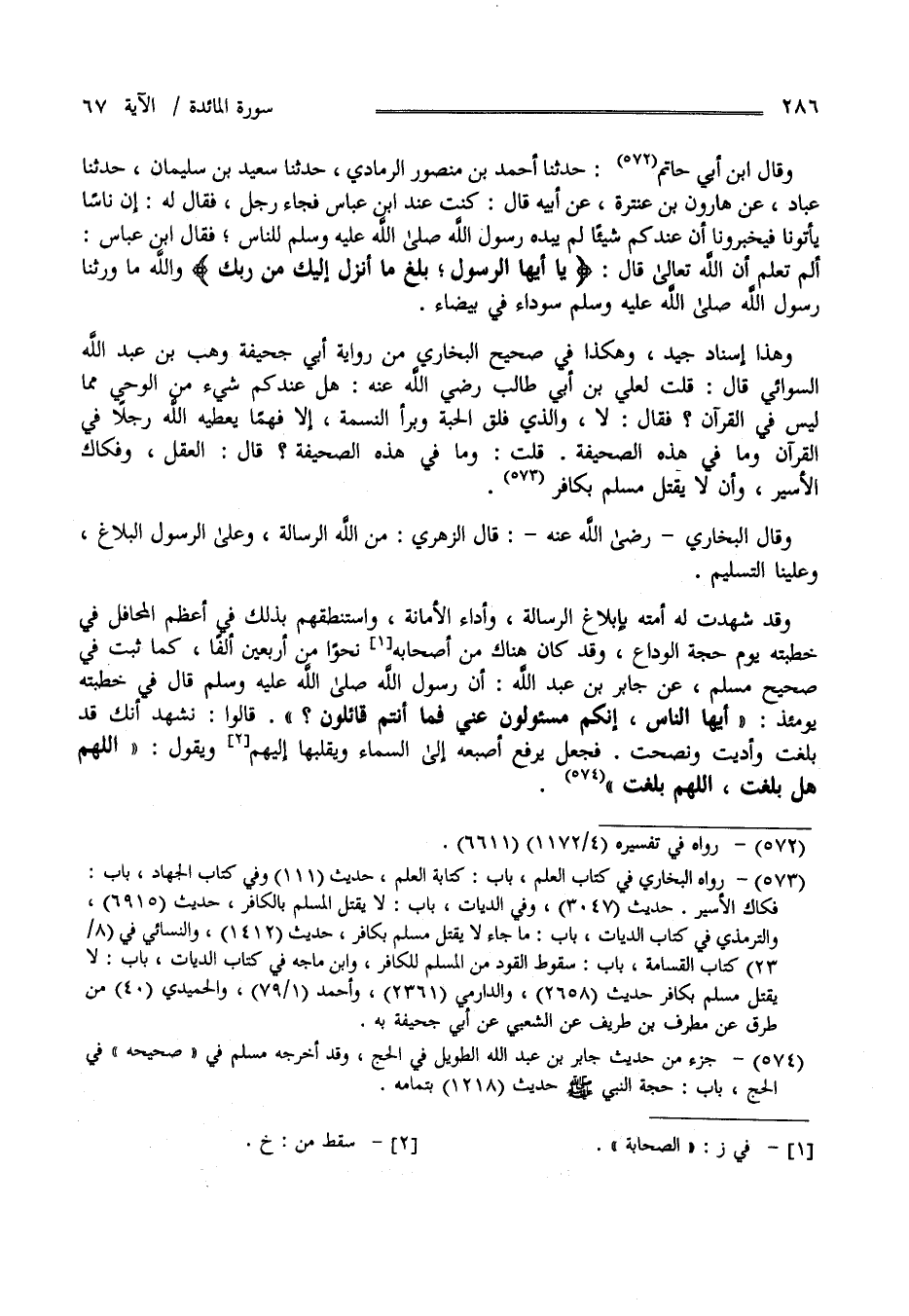 " وَقَالَ اِبْن أَبِي حَاتِم حَدَّثَنَا أَحْمَد بْن مَنْصُور الرَّمَادِيّ حَدَّثَنَا سَعِيد بْن سُلَيْمَان حَدَّثَنَا عَبَّاد عَنْ هَارُون بْن عَنْتَرَة عَنْ أَبِيهِ قَالَ كُنْت عِنْد اِبْن عَبَّاس فَجَاءَ رَجُل فَقَالَ لَهُ إِنَّ نَاسًا يَأْتُونَا فَيُخْبِرُونَا أَنَّ عِنْدكُمْ شَيْئًا لَمْ يُبْدِهِ رَسُول اللَّه - صَلَّى اللَّه عَلَيْهِ وَسَلَّمَ - لِلنَّاسِ فَقَالَ اِبْن عَبَّاس أَلَمْ تَعْلَم أَنَّ اللَّه تَعَالَى قَالَ " يَا أَيّهَا الرَّسُول بَلِّغْ مَا أُنْزِلَ إِلَيْك مِنْ رَبّك " وَاَللَّه مَا وَرَّثَنَا رَسُولُ اللَّهِ - صَلَّى اللَّه عَلَيْهِ وَسَلَّمَ - سَوْدَاءَ فِي بَيْضَاءَ .