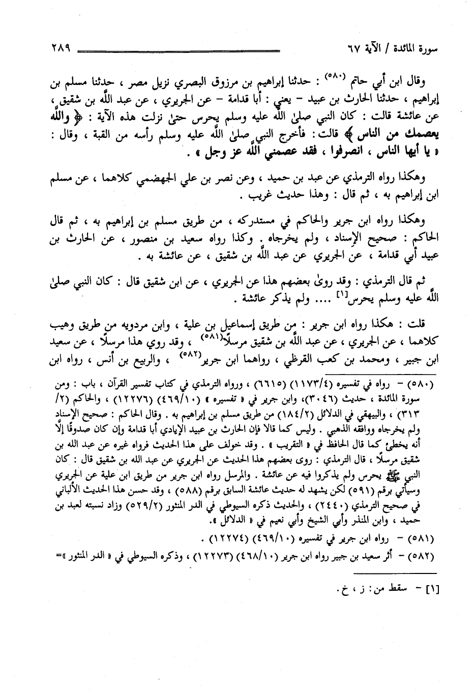 وَقَالَ اِبْن أَبِي حَاتِم حَدَّثَنَا إِبْرَاهِيم بْن مَرْزُوق الْبَصْرِيّ نَزِيل مِصْر حَدَّثَنَا مُسْلِم بْن إِبْرَاهِيم حَدَّثَنَا الْحَارِث بْن عُبَيْد - يَعْنِي أَبَا قُدَامَة - عَنْ الْجُرَيْرِيّ عَنْ عَبْد اللَّه بْن شَقِيق عَنْ عَائِشَة قَالَتْ كَانَ النَّبِيّ - صَلَّى اللَّه عَلَيْهِ وَسَلَّمَ - يُحْرَس حَتَّى نَزَلَتْ هَذِهِ الْآيَة " وَاَللَّه يَعْصِمك مِنْ النَّاس - قَالَتْ فَأَخْرَجَ النَّبِيّ - صَلَّى اللَّه عَلَيْهِ وَسَلَّمَ - رَأْسه مِنْ الْقُبَّة وَقَالَ : " يَا أَيّهَا النَّاس اِنْصَرِفُوا فَقَدْ عَصَمَنِي اللَّه عَزَّ وَجَلَّ " وَهَكَذَا رَوَاهُ التِّرْمِذِيّ عَنْ عَبْد بْن حُمَيْد وَعَنْ نَصْر بْن عَلِيّ الْجَهْضَمِيّ كِلَاهُمَا عَنْ مُسْلِم بْن إِبْرَاهِيم بِهِ ثُمَّ قَالَ وَهَذَا حَدِيث غَرِيب وَهَكَذَا رَوَاهُ اِبْن جَرِير وَالْحَاكِم فِي مُسْتَدْرَكه مِنْ طُرُق مُسْلِم بْن إِبْرَاهِيم ثُمَّ قَالَ الْحَاكِم صَحِيح الْإِسْنَاد وَلَمْ يُخَرِّجَاهُ وَكَذَا رَوَاهُ سَعِيد بْن مَنْصُور عَنْ الْحَارِث بْن عُبَيْد أَنَّ قُدَامَة الْأَيَادِي عَنْ الْجُرَيْرِيّ عَنْ عَبْد اللَّه بْن شَقِيق عَنْ عَائِشَة بِهِ ثُمَّ قَالَ التِّرْمِذِيّ وَقَدْ رَوَى بَعْضهمْ هَذَا عَنْ الْجُرَيْرِيّ عَنْ اِبْن شَقِيق قَالَ كَانَ النَّبِيّ - صَلَّى اللَّه عَلَيْهِ وَسَلَّمَ - يُحْرَس حَتَّى نَزَلَتْ هَذِهِ الْآيَة وَلَمْ يَذْكُر عَائِشَة قُلْت هَكَذَا رَوَاهُ اِبْن جَرِير مِنْ طَرِيق إِسْمَاعِيل بْن عُلَيَّة وَابْن مَرْدُوَيْهِ مِنْ طَرِيق وُهَيْب كِلَاهُمَا عَنْ الْجُرَيْرِيّ عَنْ عَبْد اللَّه بْن شَقِيق مُرْسَلًا وَقَدْ رَوَى هَذَا مُرْسَلًا عَنْ سَعِيد بْن جُبَيْر وَمُحَمَّد بْن كَعْب الْقُرَظِيّ رَوَاهُمَا اِبْن جَرِير وَالرَّبِيع بْن أَنَس رَوَاهُ اِبْن