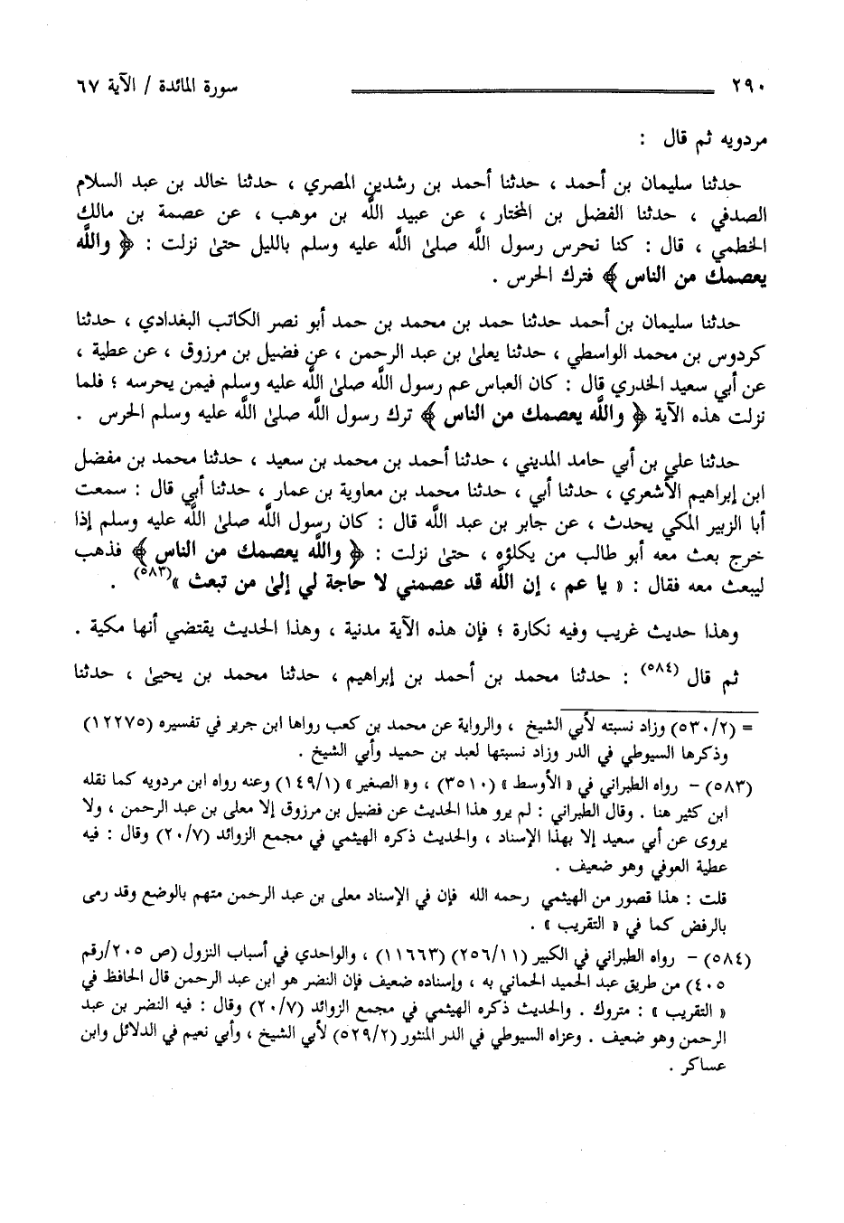 فُضَيْل بْن مَرْزُوق عَنْ عَطِيَّة عَنْ أَبِي سَعِيد الْخُدْرِيّ قَالَ : كَانَ الْعَبَّاس عَمّ رَسُول اللَّه - صَلَّى اللَّه عَلَيْهِ وَسَلَّمَ - فِيمَنْ يَحْرُسهُ فَلَمَّا نَزَلَتْ هَذِهِ الْآيَة " وَاَللَّه يَعْصِمك مِنْ النَّاس تَرَكَ رَسُول اللَّه - صَلَّى اللَّه عَلَيْهِ وَسَلَّمَ - الْحَرْس حَدَّثَنَا عَلِيّ بْن أَبِي حَامِد الْمَدِينِيّ حَدَّثَنَا أَحْمَد بْن مُحَمَّد بْن سَعِيد حَدَّثَنَا مُحَمَّد بْن مُفَضَّل بْن إِبْرَاهِيم الْأَشْعَرِيّ حَدَّثَنَا أَبِي حَدَّثَنَا مُحَمَّد بْن مُعَاوِيَة بْن عَمَّار حَدَّثَنَا أَبِي قَالَ سَمِعْت أَبَا الزُّبَيْر الْمَكِّيّ يُحَدِّث عَنْ جَابِر بْن عَبْد اللَّه قَالَ كَانَ رَسُول اللَّه - صَلَّى اللَّه عَلَيْهِ وَسَلَّمَ - إِذَا خَرَجَ بَعَثَ مَعَهُ أَبُو طَالِب مَنْ يَكْلَؤُهُ حَتَّى نَزَلَتْ " وَاَللَّه يَعْصِمك مِنْ النَّاس " فَذَهَبَ لِيَبْعَث مَعَهُ فَقَالَ يَا عَمّ إِنَّ اللَّه قَدْ عَصَمَنِي لَا حَاجَة لِي إِلَى مَنْ تَبْعَث وَهَذَا حَدِيث غَرِيب وَفِيهِ نَكَارَة فَإِنَّ هَذِهِ الْآيَة مَدَنِيَّة وَهَذَا الْحَدِيث يَقْتَضِي أَنَّهَا مَكِّيَّة ثُمَّ قَالَ حَدَّثَنَا مُحَمَّد بْن أَحْمَد بْن إِبْرَاهِيم حَدَّثَنَا مُحَمَّد بْن يَحْيَى حَدَّثَنَا