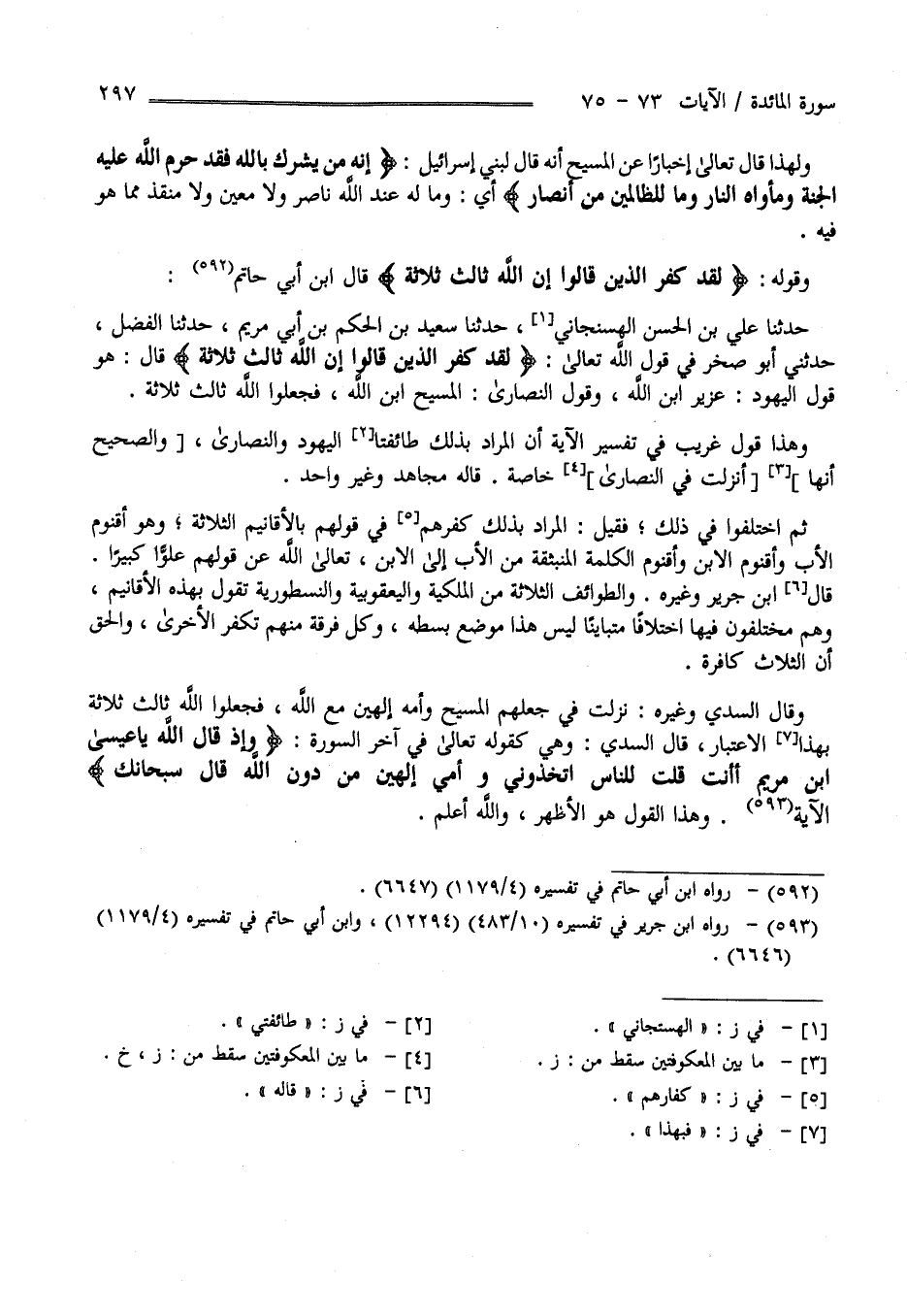 قَوْله " لَقَدْ كَفَرَ الَّذِينَ قَالُوا إِنَّ اللَّه ثَالِث ثَلَاثَة " قَالَ اِبْن أَبِي حَاتِم حَدَّثَنَا عَلِيّ بْن الْحَسَن الْهِسِنْجَانِيّ حَدَّثَنَا سَعِيد بْن الْحَكَم بْن أَبِي مَرْيَم حَدَّثَنَا الْفَضْل حَدَّثَنِي أَبُو صَخْر فِي قَوْل اللَّه تَعَالَى " لَقَدْ كَفَرَ الَّذِينَ قَالُوا إِنَّ اللَّه ثَالِث ثَلَاثَة " قَالَ هُوَ قَوْل الْيَهُود " عُزَيْر اِبْن اللَّه " وَقَوْل النَّصَارَى " الْمَسِيح اِبْن اللَّه " فَجَعَلُوا اللَّه ثَالِث ثَلَاثَة وَهَذَا قَوْل غَرِيب فِي تَفْسِير الْآيَة أَنَّ الْمُرَاد بِذَلِكَ طَائِفَتَا الْيَهُود وَالنَّصَارَى وَالصَّحِيح أَنَّهَا أُنْزِلَتْ فِي النَّصَارَى خَاصَّة قَالَهُ مُجَاهِد وَغَيْر وَاحِد ثُمَّ اِخْتَلَفُوا فِي ذَلِكَ فَقِيلَ الْمُرَاد بِذَلِكَ كُفَّارهمْ فِي قَوْلهمْ بِالْأَقَانِيمِ الثَّلَاثَة وَهُوَ : أُقْنُومُ الْأَب وَأُقْنُومُ الِابْن وَأُقْنُومُ الْكَلِمَة الْمُنْبَثِقَة مِنْ الْأَبِ إِلَى الِابْنِ تَعَالَى اللَّهُ عَنْ قَوْلهمْ عُلُوًّا كَبِيرًا قَالَ اِبْن جَرِير وَغَيْره وَالطَّوَائِف الثَّلَاثَة مِنْ الْمَلَكِيَّة وَالْيَعْقُوبِيَّة وَالنَّسْطُورِيَّة تَقُول بِهَذِهِ الْأَقَانِيم وَهُمْ مُخْتَلِفُونَ فِيهَا اِخْتِلَافًا مُتَبَايِنًا لَيْسَ هَذَا مَوْضِع بَسْطه وَكُلّ فِرْقَة مِنْهُمْ تُكَفِّر الْأُخْرَى وَالْحَقّ أَنَّ الثَّلَاثَة كَافِرَة وَقَالَ السُّدِّيّ وَغَيْره : نَزَلَتْ فِي جَعْلِهِمْ الْمَسِيح وَأُمّه إِلَهَيْنِ مَعَ اللَّه فَجَعَلُوا اللَّه ثَالِث ثَلَاثَة بِهَذَا الِاعْتِبَار قَالَ السُّدِّيّ وَهِيَ كَقَوْلِهِ تَعَالَى فِي آخِر السُّورَة " وَإِذْ قَالَ اللَّه يَا عِيسَى اِبْن مَرْيَم أَأَنْتَ قُلْت لِلنَّاسِ اِتَّخِذُونِي وَأُمِّيَ إِلَهَيْنِ مِنْ دُون اللَّه قَالَ سُبْحَانك " الْآيَة وَهَذَا الْقَوْل هُوَ الْأَظْهَر وَاَللَّه أَعْلَم .