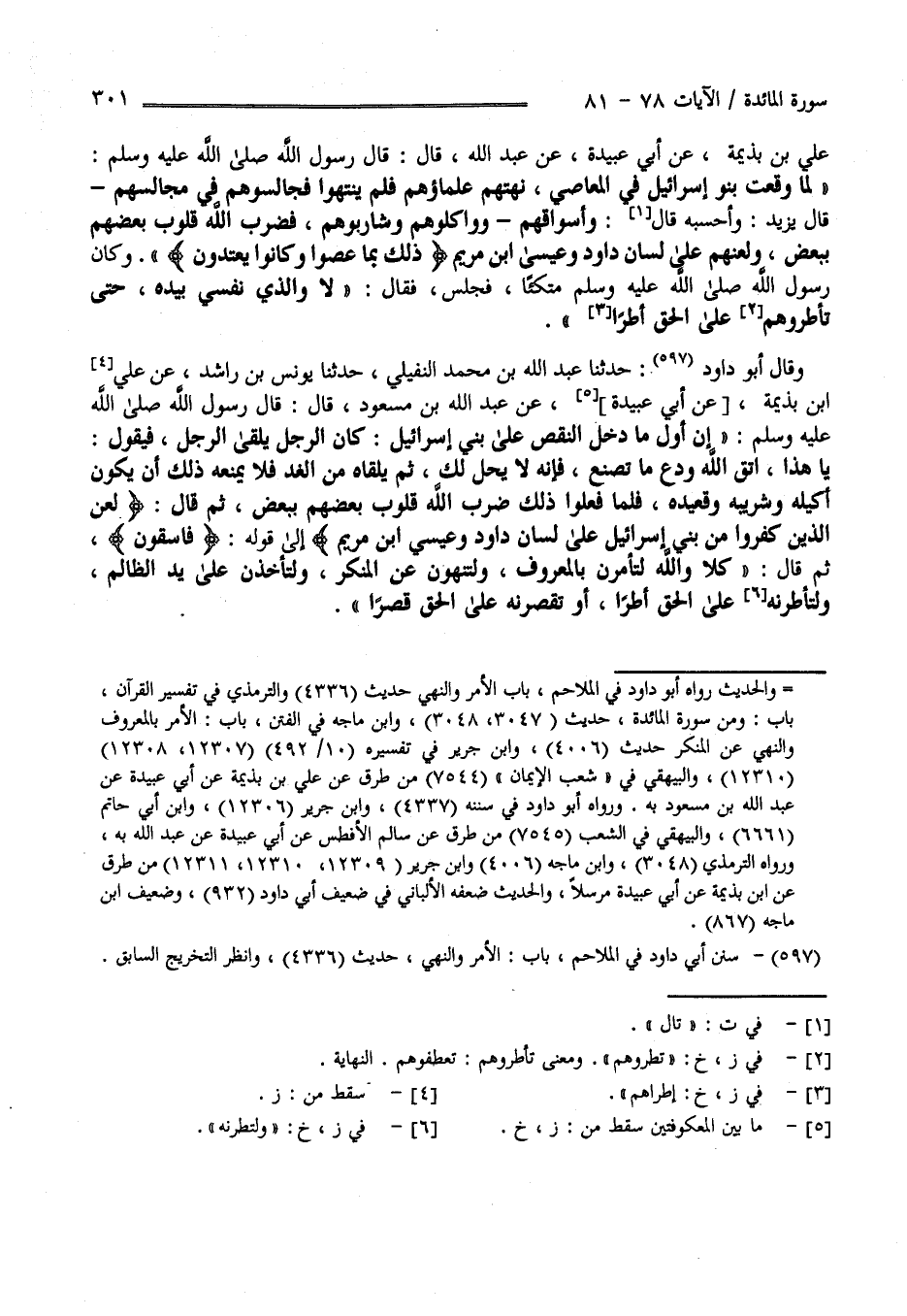 عَلِيّ بْن بَذِيمَة عَنْ أَبِي عَبْدَة عَنْ عَبْد اللَّه قَالَ : قَالَ رَسُول اللَّه صَلَّى اللَّه عَلَيْهِ وَسَلَّمَ لَمَّا وَقَعَتْ بَنُو إِسْرَائِيل فِي الْمَعَاصِي نَهَتْهُمْ عُلَمَاؤُهُمْ فَلَمْ يَنْتَهُوا فَجَالَسُوهُمْ فِي مَجَالِسهمْ قَالَ يَزِيد وَأَحْسَبُهُ قَالَ فِي أَسْوَاقهمْ وَوَاكَلُوهُمْ وَشَارَبُوهُمْ فَضَرَبَ اللَّه قُلُوب بَعْضهمْ بِبَعْضٍ وَلَعَنَهُمْ عَلَى لِسَان دَاوُدَ وَعِيسَى اِبْن مَرْيَم ذَلِكَ بِمَا " عَصَوْا وَكَانُوا يَعْتَدُونَ " وَكَانَ رَسُول اللَّه صَلَّى اللَّه عَلَيْهِ وَسَلَّمَ مُتَّكِئًا فَجَلَسَ فَقَالَ : " لَا وَاَلَّذِي نَفْسِي بِيَدِهِ حَتَّى تَأْطُرُوهُمْ عَلَى الْحَقّ أَطْرًا " وَقَالَ أَبُو دَاوُدَ حَدَّثَنَا عَبْد اللَّه بْن مُحَمَّد النُّفَيْلِيّ حَدَّثَنَا يُونُس بْن رَاشِد عَنْ عَلِيّ بْن بَذِيمَة عَنْ أَبِي عُبَيْدَة عَنْ عَبْد اللَّه بْن مَسْعُود قَالَ : قَالَ رَسُول اللَّه صَلَّى اللَّه عَلَيْهِ وَسَلَّمَ إِنَّ أَوَّل مَا دَخَلَ النَّقْص عَلَى بَنِي إِسْرَائِيل كَانَ الرَّجُل فَيَقُول يَا هَذَا اِتَّقِ اللَّه وَدَعْ مَا تَصْنَع فَإِنَّهُ لَا يَحِلّ لَك ثُمَّ يَلْقَاهُ مِنْ الْغَد فَلَا يَمْنَعهُ ذَلِكَ أَنْ يَكُون أَكِيلهُ وَشَرِيبه وَقَعِيده فَلَمَّا فَعَلُوا ذَلِكَ ضَرَبَ اللَّه قُلُوب بَعْضهمْ بِبَعْضٍ ثُمَّ قَالَ " لُعِنَ الَّذِينَ كَفَرُوا مِنْ بَنِي إِسْرَائِيل عَلَى لِسَان دَاوُدَ وَعِيسَى اِبْن مَرْيَم " إِلَى قَوْله" فَاسِقُونَ " ثُمَّ قَالَ كَلَّا وَاَللَّه لَتَأْمُرُنَّ بِالْمَعْرُوفِ وَلَتَنْهَوُنَّ عَنْ الْمُنْكَر وَلَتَأْخُذُنَّ عَلَى يَد الظَّالِم وَلَتَأْطُرُنَّهُ عَلَى الْحَقّ أَطْرًا أَوْ تَقْصُرُنَّهُ عَلَى