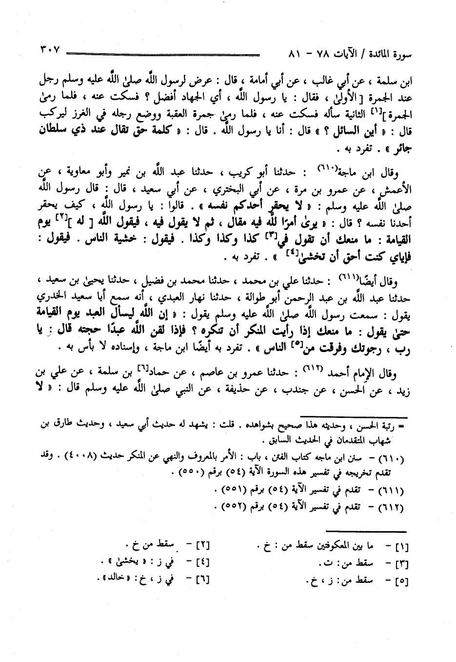 عَنْهُ فَلَمَّا رَمَى الْعَقَبَة الثَّانِيَة سَأَلَهُ فَسَكَتَ عَنْهُ فَلَمَّا رَمَى جَمْرَة الْعَقَبَة وَوَضَعَ رِجْله فِي الْغَرْز لِيَرْكَب فَقَالَ أَيْنَ السَّائِل ؟ قَالَ أَنَا يَا رَسُول اللَّه قَالَ : " كَلِمَة حَقّ تُقَال عِنْد ذِي سُلْطَان جَائِر " تَفَرَّدَ بِهِ وَقَالَ اِبْن مَاجَهْ حَدَّثَنَا أَبُو كُرَيْب حَدَّثَنَا عَبْد اللَّه بْن نُمَيْر وَأَبُو مُعَاوِيَة عَنْ الْأَعْمَش عَنْ عَمْرو بْن مُرَّة عَنْ أَبِي الْبَخْتَرِيّ عَنْ أَبِي سَعِيد قَالَ : قَالَ رَسُول اللَّه صَلَّى اللَّه عَلَيْهِ وَسَلَّمَ : " لَا يَحْقِر أَحَدكُمْ نَفْسه قَالُوا يَا رَسُول اللَّه كَيْفَ يَحْقِر أَحَدُنَا نَفْسَهُ قَالَ يَرَى أَمْرًا لِلَّهِ فِيهِ مَقَال ثُمَّ لَا يَقُول فِيهِ فَيَقُول اللَّه يَوْم الْقِيَامَة مَا مَنَعَك أَنْ تَقُول فِي كَذَا كَذَا وَكَذَا فَيَقُول خَشْيَة النَّاس فَيَقُول فَإِيَّايَ كُنْت أَحَقّ أَنْ تَخْشَى " تَفَرَّدَ بِهِ وَقَالَ أَيْضًا حَدَّثَنَا عَلِيّ بْن مُحَمَّد حَدَّثَنَا مُحَمَّد بْن فُضَيْل حَدَّثَنَا يَحْيَى بْن سَعِيد حَدَّثَنَا عَبْد اللَّه بْن عَبْد الرَّحْمَن أَبُو طُوَالَة حَدَّثَنَا نَهَار الْعَبْدِيّ أَنَّهُ سَمِعَ أَبَا سَعِيد الْخُدْرِيّ يَقُول سَمِعْت رَسُول اللَّه صَلَّى اللَّه عَلَيْهِ وَسَلَّمَ يَقُول : " إِنَّ اللَّه لَيَسْأَل الْعَبْد يَوْم الْقِيَامَة حَتَّى يَقُول مَا مَنَعَك إِذَا رَأَيْت الْمُنْكَر أَنْ تُنْكِرهُ فَإِذَا لَقَّنَ اللَّهُ عَبْدًا حُجَّتَهُ قَالَ يَا رَبِّ رَجَوْتُك وَفَرِقْت النَّاس " تَفَرَّدَ بِهِ أَيْضًا اِبْن مَاجَهْ وَإِسْنَاده لَا بَأْس بِهِ وَقَالَ الْإِمَام أَحْمَد حَدَّثَنَا عَمْرو بْن عَاصِم عَنْ حَمَّاد بْن سَلَمَة عَنْ عَلِيّ بْن زَيْد عَنْ الْحَسَن عَنْ جُنْدَب عَنْ حُذَيْفَة عَنْ النَّبِيّ صَلَّى اللَّه عَلَيْهِ وَسَلَّمَ قَالَ :" لَا