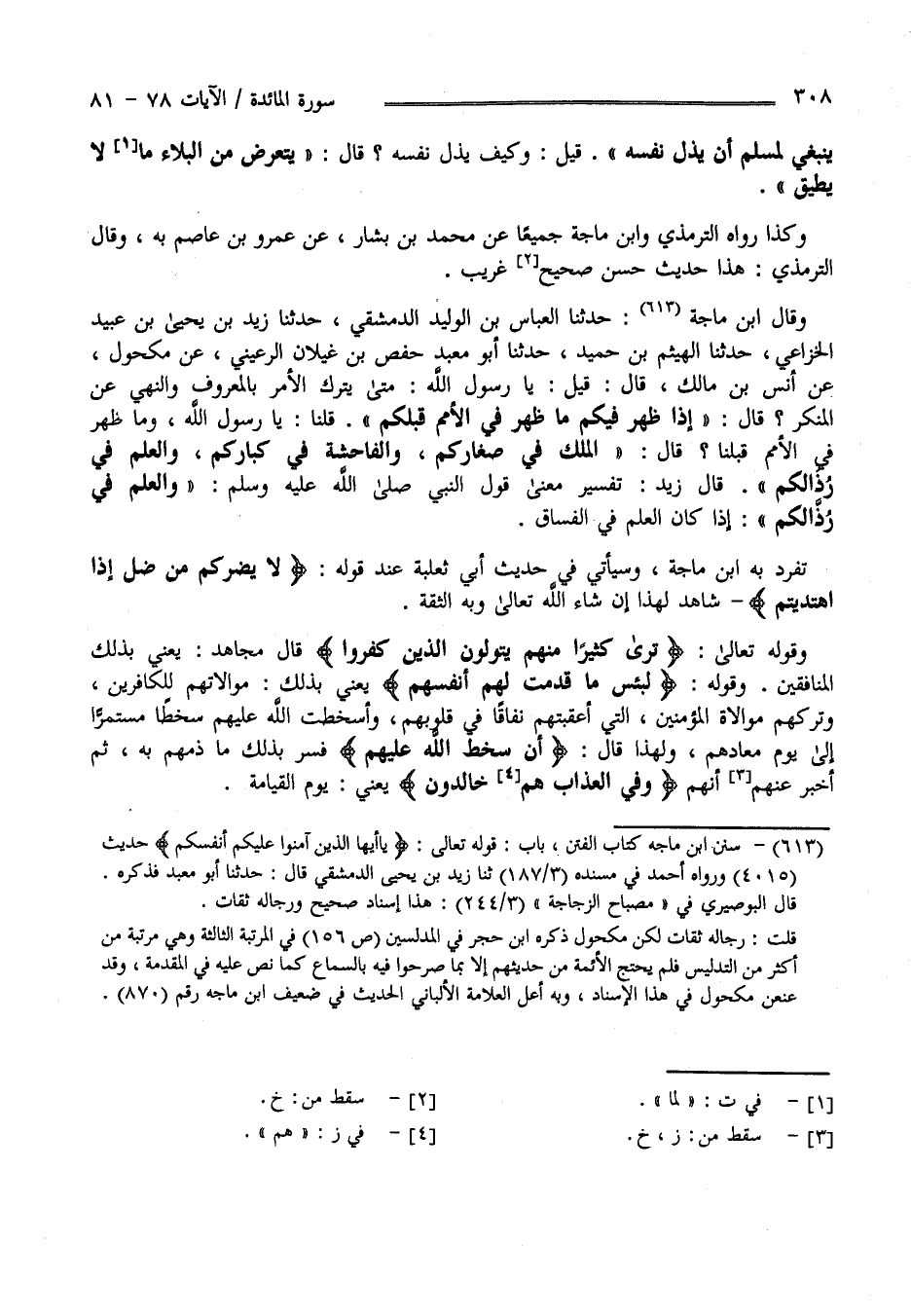 تَفَرَّدَ بِهِ اِبْن مَاجَهْ وَسَيَأْتِي فِي حَدِيث أَبِي ثَعْلَبَة عِنْد قَوْله " لَا يَضُرّكُمْ مَنْ ضَلَّ إِذَا اِهْتَدَيْتُمْ " شَاهِد لِهَذَا إِنْ شَاءَ اللَّه تَعَالَى وَبِهِ الثِّقَة .