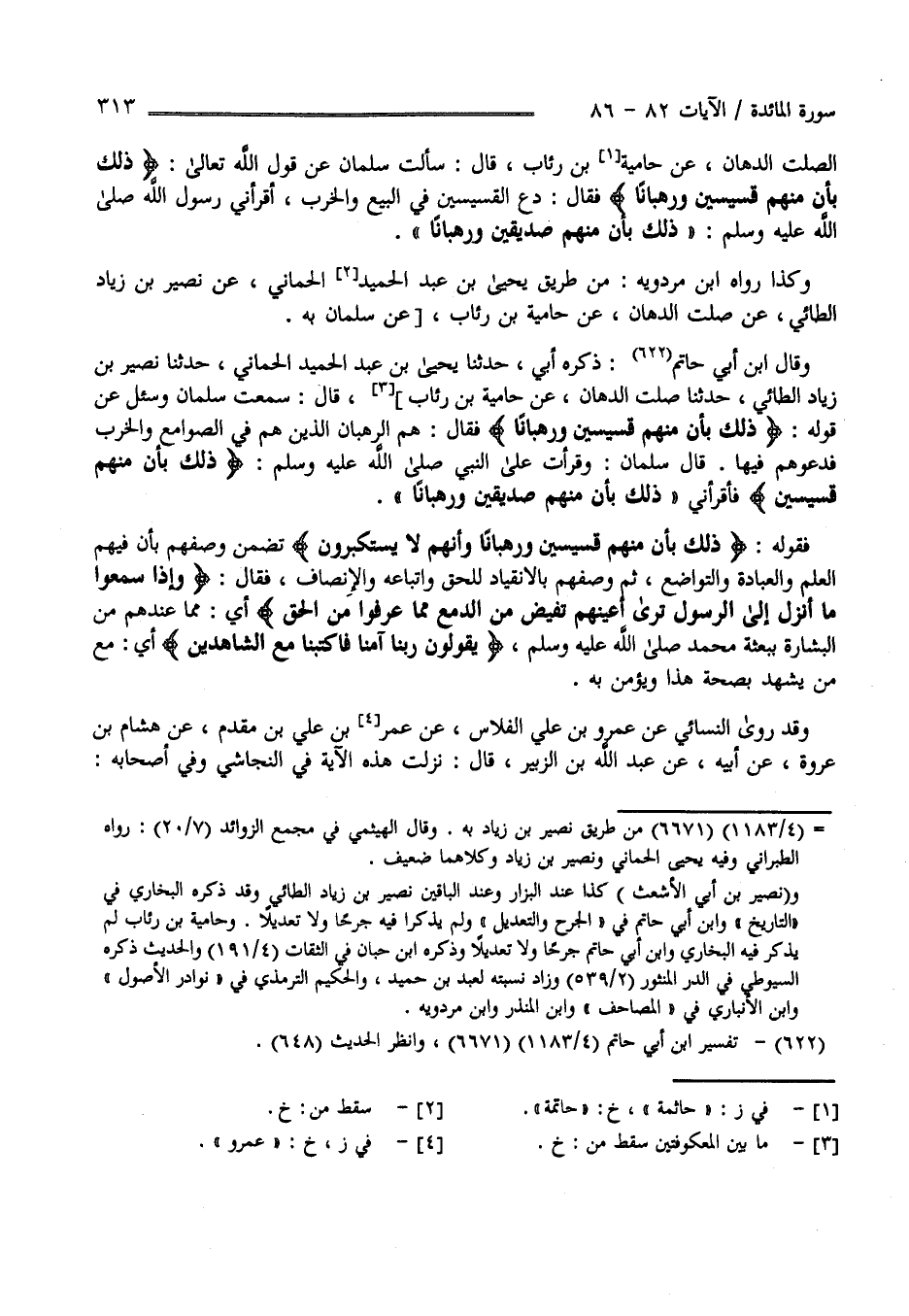 وَكَذَا رَوَاهُ اِبْن مَرْدُوَيْهِ مِنْ طَرِيق يَحْيَى بْن عَبْد الْحَمِيد الْخَانِيّ عَنْ نَضِير بْن زِيَاد الطَّائِيّ عَنْ صَلْت الدَّهَّان عَنْ جَاثِمَة بْن رِئَاب عَنْ سَلْمَان بِهِ وَقَالَ اِبْن أَبِي حَاتِم ذَكَرَهُ أَبِي حَدَّثَنَا يَحْيَى بْن عَبْد الْحَمِيد الْخَانِيّ حَدَّثَنَا نَضِير بْن زِيَاد الطَّائِيّ حَدَّثَنَا صَلْت الدَّهَّان عَنْ جَاثِمَة بْن رِئَاب قَالَ سَمِعْت سَلْمَان وَسُئِلَ عَنْ قَوْله " ذَلِكَ بِأَنَّ مِنْهُمْ قِسِّيسِينَ وَرُهْبَانًا " فَقَالَ هُمْ الرُّهْبَان الَّذِينَ هُمْ فِي الصَّوَامِع وَالْخَرِب فَدَعُوهُمْ فِيهَا قَالَ سَلْمَان : وَقَرَأْت عَلَى النَّبِيّ صَلَّى اللَّه عَلَيْهِ وَسَلَّمَ ذَلِكَ بِأَنَّ مِنْهُمْ قِسِّيسِينَ فَأَقْرَأَنِي ذَلِكَ بِأَنَّ مِنْهُمْ صِدِّيقِينَ وَرُهْبَانًا فَقَوْله : " ذَلِكَ بِأَنَّ مِنْهُمْ قِسِّيسِينَ وَرُهْبَانًا وَأَنَّهُمْ لَا يَسْتَكْبِرُونَ " تَضَمَّنَ وَصْفهمْ بِأَنَّ فِيهِمْ الْعِلْم وَالْعِبَادَة وَالتَّوَاضُع ثُمَّ وَصَفَهُمْ بِالِانْقِيَادِ لِلْحَقِّ وَاتِّبَاعه وَالْإِنْصَاف .