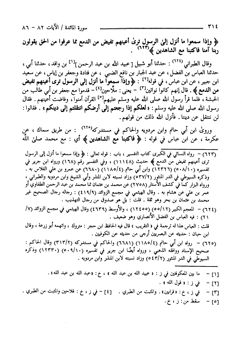 " وَإِذَا سَمِعُوا مَا أُنْزِلَ إِلَى الرَّسُول تَرَى أَعْيُنهمْ تَفِيض مِنْ الدَّمْع مِمَّا عَرَفُوا مِنْ الْحَقّ يَقُولُونَ رَبّنَا آمَنَّا فَاكْتُبْنَا مَعَ الشَّاهِدِينَ" وَرَوَى اِبْن أَبِي حَاتِم وَابْن مَرْدُوَيْهِ وَالْحَاكِم فِي مُسْتَدْرَكه عَنْ طَرِيق سِمَاك عَنْ عِكْرِمَة عَنْ اِبْن عَبَّاس فِي قَوْله " فَاكْتُبْنَا مَعَ الشَّاهِدِينَ " أَيْ مَعَ مُحَمَّد صَلَّى اللَّه