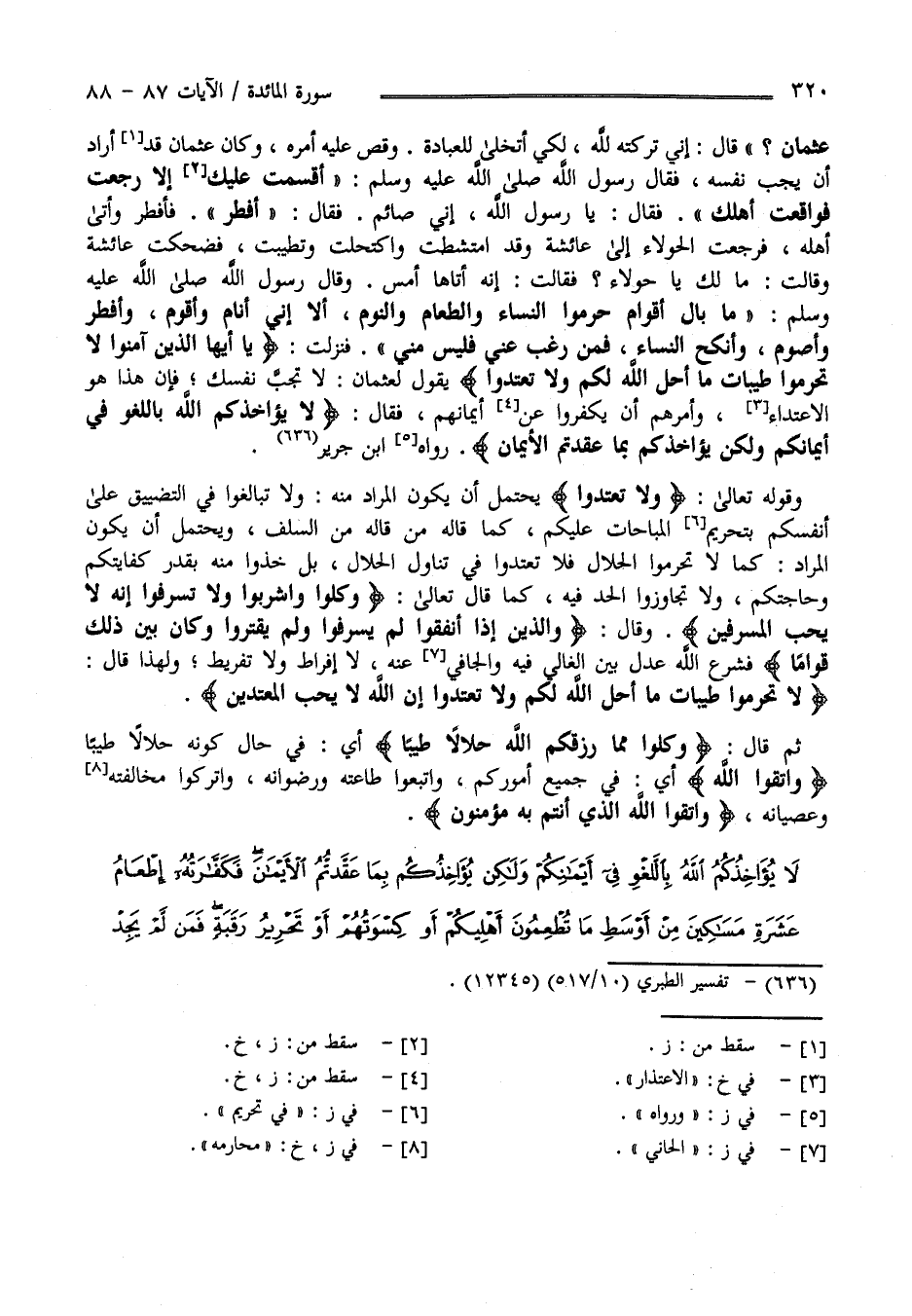 عُثْمَان قَالَ إِنِّي تَرَكْته لِلَّهِ لِكَيْ أَتَخَلَّى لِلْعِبَادَاتِ وَقَصَّ عَلَيْهِ أَمْره وَكَانَ عُثْمَان قَدْ أَرَادَ أَنْ يَجُبَّ نَفْسه فَقَالَ رَسُول اللَّه صَلَّى اللَّه عَلَيْهِ وَسَلَّمَ : " أَقْسَمْت عَلَيْك إِلَّا رَجَعْت فَوَاقَعْت أَهْلك " فَقَالَ يَا رَسُول اللَّه إِنِّي صَائِم فَقَالَ : أَفْطِرْ قَالَ فَأَفْطَرَ وَأَتَى أَهْله فَرَجَعَتْ الْحَوْلَاء إِلَى عَائِشَة وَقَدْ اِمْتَشَطَتْ وَاغْتَسَلَتْ وَتَطَيَّبَتْ فَضَحِكَتْ عَائِشَة وَقَالَتْ : مَا لَك يَا حَوْلَاء فَقَالَتْ إِنَّهُ آتَاهَا أَمْسِ وَقَالَ رَسُول اللَّه صَلَّى اللَّه عَلَيْهِ وَسَلَّمَ : " مَا بَال أَقْوَام حَرَّمُوا النِّسَاء وَالطَّعَام وَالنَّوْم أَلَا إِنِّي أَنَام وَأَقُوم وَأُفْطِر وَأَصُوم وَأَنْكِح النِّسَاء فَمَنْ رَغِبَ عَنِّي فَلَيْسَ مِنِّي فَنَزَلَتْ " يَا أَيّهَا الَّذِينَ آمَنُوا لَا تُحَرِّمُوا طَيِّبَات مَا أَحَلَّ اللَّه لَكُمْ وَلَا تَعْتَدُوا " يَقُول لِعُثْمَان لَا تَجُبّ نَفْسك فَإِنَّ هَذَا هُوَ الِاعْتِدَاء وَأَمَرَهُمْ أَنْ يُكَفِّرُوا عَنْ أَيْمَانهمْ فَقَالَ " لَا يُؤَاخِذكُمْ اللَّه بِاللَّغْوِ فِي أَيْمَانكُمْ وَلَكِنْ يُؤَاخِذكُمْ بِمَا عَقَّدْتُمْ الْأَيْمَان" رَوَاهُ اِبْن جَرِير وَقَوْله تَعَالَى " وَلَا تَعْتَدُوا " يَحْتَمِل أَنْ يَكُون الْمُرَاد مِنْهُ وَلَا تُبَالِغُوا فِي التَّضْيِيق عَلَى أَنْفُسكُمْ