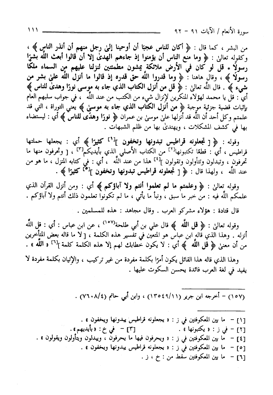 الْبَشَر كَمَا قَالَ " أَكَانَ لِلنَّاسِ عَجَبًا أَنْ أَوْحَيْنَا إِلَى رَجُل مِنْهُمْ أَنْ أَنْذِرْ النَّاس" وَكَقَوْلِهِ تَعَالَى " وَمَا مَنَعَ النَّاس أَنْ يُؤْمِنُوا إِذْ جَاءَهُمْ الْهُدَى إِلَّا أَنْ قَالُوا أَبْعَث اللَّه بَشَرًا رَسُولًا قُلْ لَوْ كَانَ فِي الْأَرْض مَلَائِكَة يَمْشُونَ مُطْمَئِنِّينَ لَنَزَّلْنَا عَلَيْهِمْ مِنْ السَّمَاء مَلَكًا رَسُولًا " وَقَالَ هَهُنَا " وَمَا قَدَرُوا اللَّه حَقّ قَدْره إِذْ قَالُوا مَا أَنْزَلَ اللَّه عَلَى بَشَر مِنْ شَيْء " قَالَ اللَّه تَعَالَى " قُلْ مَنْ أَنْزَلَ الْكِتَاب الَّذِي جَاءَ بِهِ مُوسَى نُورًا وَهُدًى لِلنَّاسِ " أَيْ قُلْ يَا مُحَمَّد لِهَؤُلَاءِ الْمُنْكِرِينَ لِإِنْزَالِ شَيْء مِنْ الْكُتُب مِنْ عِنْد اللَّه فِي جَوَاب سَلْبهمْ الْعَام بِإِثْبَاتِ قَضِيَّة جُزْئِيَّة مُوجِبَة " مَنْ أَنْزَلَ الْكِتَاب الَّذِي جَاءَ بِهِ مُوسَى" وَهُوَ التَّوْرَاة الَّتِي قَدْ عَلِمْتُمْ وَكُلّ أَحَد أَنَّ اللَّه قَدْ أَنْزَلَهَا عَلَى مُوسَى بْن عِمْرَان نُورًا وَهُدًى لِلنَّاسِ أَيْ لِيُسْتَضَاءَ بِهَا فِي كَشْف الْمُشْكِلَات وَيُهْتَدَى بِهَا مِنْ ظُلَم الشُّبُهَات وَقَوْله " تَجْعَلُونَهُ قَرَاطِيس تُبْدُونَهَا وَتُخْفُونَ كَثِيرًا " أَيْ تَجْعَلُونَ جُمْلَتهَا قَرَاطِيس أَيْ قِطَعًا تَكْتُبُونَهَا مِنْ الْكِتَاب الْأَصْلِيّ الَّذِي بِأَيْدِيكُمْ وَتُحَرَّفُونَ مِنْهَا مَا تُحَرِّفُونَ وَتُبَدِّلُونَ وَتَتَأَوَّلُونَ وَتَقُولُونَ هَذَا مِنْ عِنْد اللَّه أَيْ فِي كِتَابه الْمُنَزَّل وَمَا هُوَ مِنْ عِنْد اللَّه وَلِهَذَا قَالَ " تَجْعَلُونَهُ قَرَاطِيس تُبْدُونَهَا وَتُخْفُونَ كَثِيرًا " وَقَوْله تَعَالَى " وَعُلِّمْتُمْ مَا لَمْ تَعْلَمُوا أَنْتُمْ وَلَا آبَاؤُكُمْ " أَيْ وَمَنْ أَنْزَلَ الْقُرْآن الَّذِي عَلَّمَكُمْ اللَّه فِيهِ مِنْ خَبَر مَا سَبَقَ وَنَبَأ مَا يَأْتِي مَا لَمْ تَكُونُوا تَعْلَمُونَ ذَلِكَ لَا أَنْتُمْ وَلَا آبَاؤُكُمْ وَقَدْ قَالَ قَتَادَة : هَؤُلَاءِ مُشْرِكُو الْعَرَب وَقَالَ مُجَاهِد هَذِهِ لِلْمُسْلِمِينَ وَقَوْله تَعَالَى " قُلْ اللَّه " قَالَ عَلِيّ بْن أَبِي طَلْحَة عَنْ اِبْن عَبَّاس أَيْ قُلْ اللَّه أَنْزَلَهُ وَهَذَا الَّذِي قَالَهُ اِبْن عَبَّاس هُوَ الْمُتَعَيِّن فِي تَفْسِير هَذِهِ الْكَلِمَة لَا مَا قَالَهُ بَعْض الْمُتَأَخِّرِينَ مِنْ أَنَّ مَعْنَى " قُلْ اللَّه " أَيْ لَا يَكُون خِطَاب لَهُمْ إِلَّا هَذِهِ الْكَلِمَة كَلِمَة " اللَّه " وَهَذَا الَّذِي قَالَهُ هَذَا الْقَائِل يَكُون أَمْرًا بِكَلِمَةٍ مُفْرَدَة مِنْ غَيْر تَرْكِيب وَالْإِتْيَان بِكَلِمَةٍ مُفْرَدَة لَا يُفِيد فِي لُغَة الْعَرَب فَائِدَة يَحْسُن السُّكُوت عَلَيْهَا