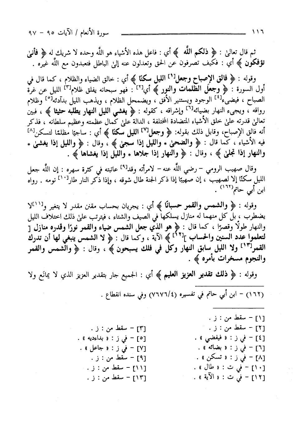 وَقَوْله " فَالِق الْإِصْبَاح وَجَعَلَ اللَّيْل سَكَنًا " أَيْ خَالِق الضِّيَاء وَالظَّلَام كَمَا قَالَ فِي أَوَّل السُّورَة " وَجَعَلَ الظُّلُمَات وَالنُّور" أَيْ فَهُوَ سُبْحَانه يَفْلِق ظَلَام اللَّيْل عَنْ غُرَّة الصَّبَاح فَيُضِيء الْوُجُود وَيَسْتَنِير الْأُفُق وَيَضْمَحِلّ الظَّلَام وَيُذْهِب اللَّيْل بِسَوَادِهِ وَظَلَام رِوَاقه وَيُجَيِّئ النَّهَار بِضِيَائِهِ وَإِشْرَاقه كَقَوْلِهِ " يُغْشِي اللَّيْل النَّهَار يَطْلُبهُ حَثِيثًا" فَبَيَّنَ تَعَالَى قُدْرَته عَلَى خَلْق الْأَشْيَاء الْمُتَضَادَّة الْمُخْتَلِفَة الدَّالَّة عَلَى كَمَالِ عَظَمَته وَعَظِيم سُلْطَانه فَذَكَرَ أَنَّهُ فَالِق الْإِصْبَاح وَقَابَلَ ذَلِكَ بِقَوْلِهِ " وَجَعَلَ اللَّيْل سَكَنًا " أَيْ سَاجِيًا مُظْلِمًا لِتَسْكُن فِيهِ الْأَشْيَاء كَمَا قَالَ " وَالضُّحَى وَاللَّيْل إِذَا سَجَى " وَقَالَ" وَاللَّيْل إِذَا يَغْشَى وَالنَّهَار إِذَا تَجَلَّى " وَقَالَ " وَالنَّهَار إِذَا جَلَّاهَا وَاللَّيْل إِذَا يَغْشَاهَا " وَقَالَ صُهَيْب الرُّومِيّ رَضِيَ اللَّه عَنْهُ لِامْرَأَتِهِ وَقَدْ عَاتَبَتْهُ فِي كَثْرَة سَهَره : إِنَّ اللَّه جَعَلَ اللَّيْل سَكَنًا إِلَّا لِصُهَيْب إِنَّ صُهَيْبًا إِذَا ذَكَرَ الْجَنَّة طَالَ شَوْقُهُ وَإِذَا ذَكَرَ النَّار طَارَ نَوْمُهُ .