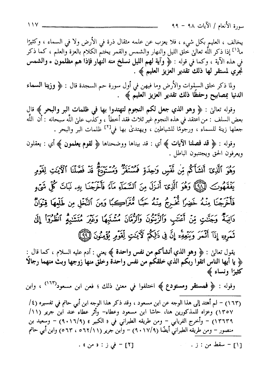يَقُول تَعَالَى " وَهُوَ الَّذِي أَنْشَأَكُمْ مِنْ نَفْس وَاحِدَة " يَعْنِي آدَم عَلَيْهِ السَّلَام قَالَ " يَا أَيّهَا النَّاس اِتَّقُوا رَبّكُمْ الَّذِي خَلَقَكُمْ مِنْ نَفْس وَاحِدَة وَخَلَقَ مِنْهَا زَوْجهَا وَبَثَّ مِنْهُمَا رِجَالًا كَثِيرًا وَنِسَاء " وَقَوْله " فَمُسْتَقَرّ وَمُسْتَوْدَع " اِخْتَلَفُوا فِي مَعْنَى ذَلِكَ فَعَنْ اِبْن مَسْعُود وَابْن