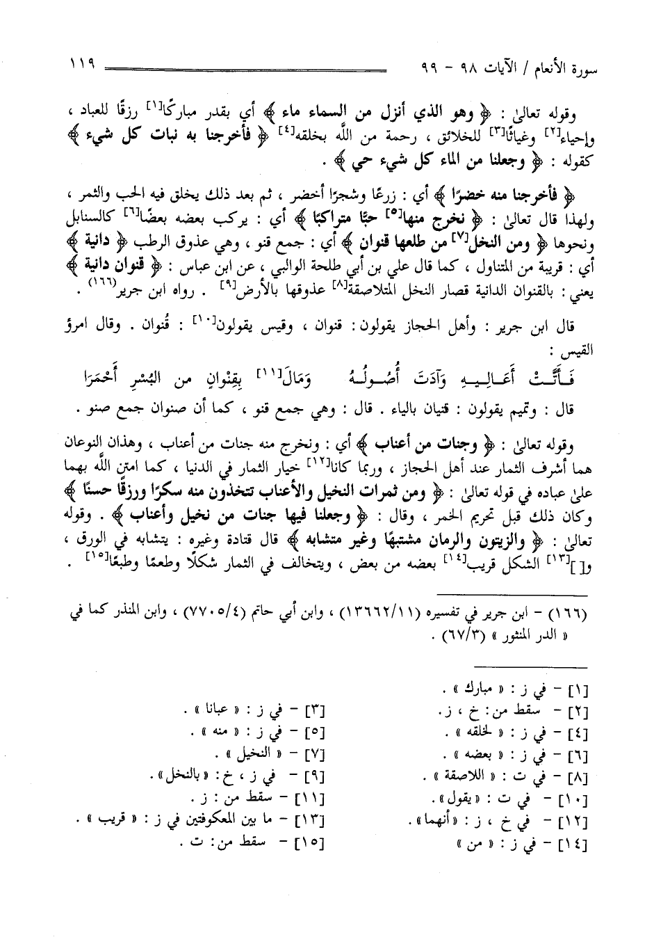 قَالَ وَتَمِيم يَقُولُونَ قُنْيَان بِالْيَاءِ قَالَ وَهِيَ جَمْع قِنْو كَمَا أَنَّ صِنْوَان جَمْع صِنْو وَقَوْله تَعَالَى " وَجَنَّات مِنْ أَعْنَاب " أَيْ وَنُخْرِج مِنْهُ جَنَّات مِنْ أَعْنَاب وَهَذَانِ النَّوْعَانِ هُمَا أَشْرَف الثِّمَار عِنْد أَهْل الْحِجَاز وَرُبَّمَا كَانَا خِيَار الثِّمَار فِي الدُّنْيَا كَمَا اِمْتَنَّ اللَّه بِهِمَا عَلَى عِبَاده فِي قَوْله تَعَالَى " وَمِنْ ثَمَرَات النَّخِيل وَالْأَعْنَاب تَتَّخِذُونَ مِنْهُ سَكَرًا وَرِزْقًا حَسَنًا " وَكَانَ ذَلِكَ قَبْل تَحْرِيم الْخَمْر وَقَالَ " وَجَعَلْنَا فِيهَا جَنَّات مِنْ نَخِيل وَأَعْنَاب " وَقَوْله تَعَالَى " وَالزَّيْتُون وَالرُّمَّان مُشْتَبِهًا وَغَيْر مُتَشَابِه" قَالَ قَتَادَة وَغَيْره مُتَشَابِه فِي الْوَرَق وَالشَّكْل قَرِيب بَعْضه مِنْ بَعْض وَمُخْتَلِف فِي الثِّمَار شَكْلًا وَطَعْمًا وَطَبْعًا