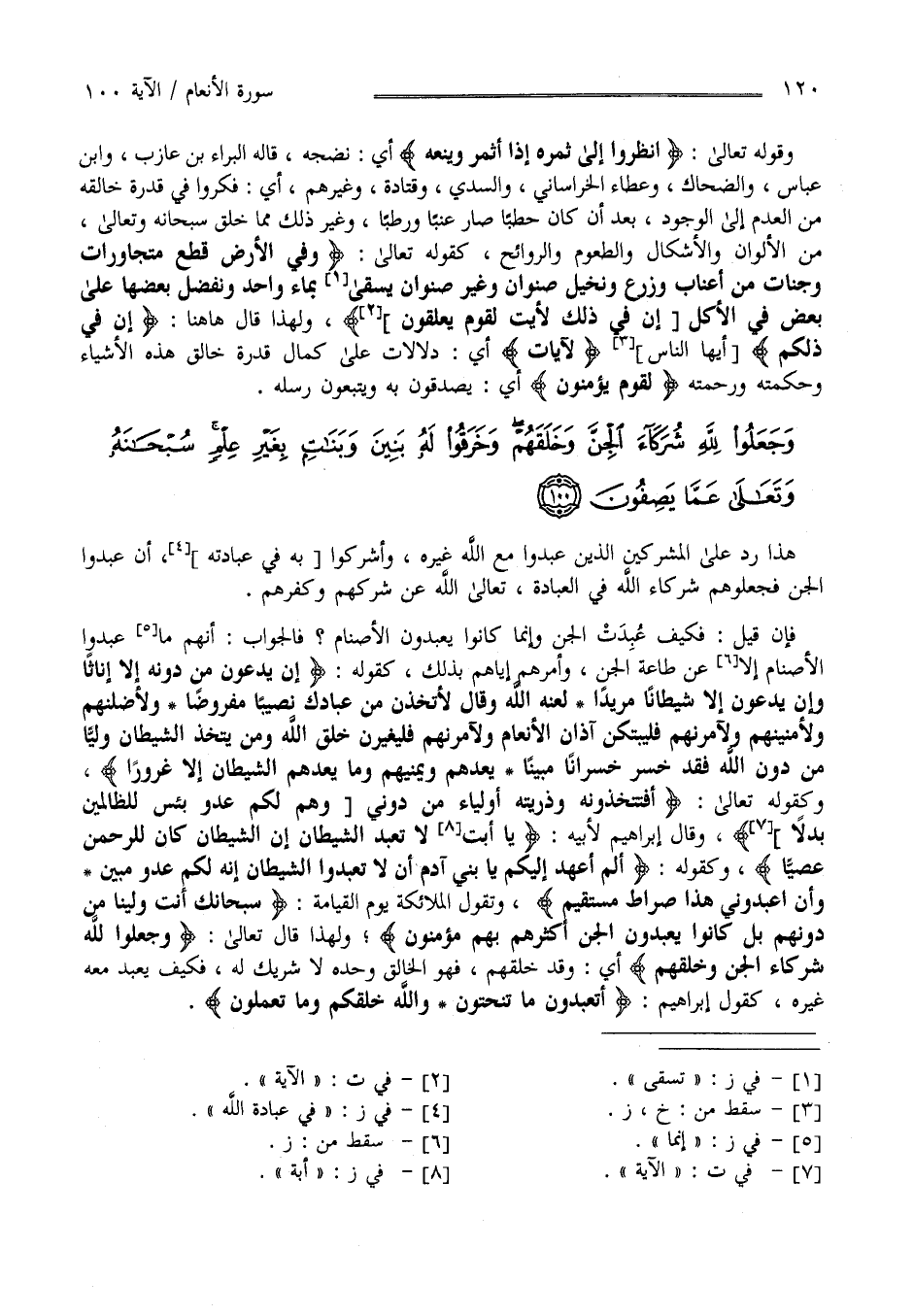 وَجَعَلُوا لِلَّهِ شُرَكَاءَ الْجِنَّ وَخَلَقَهُمْ وَخَرَقُوا لَهُ بَنِينَ وَبَنَاتٍ بِغَيْرِ عِلْمٍ سُبْحَانَهُ وَتَعَالَى عَمَّا يَصِفُونَ (100)