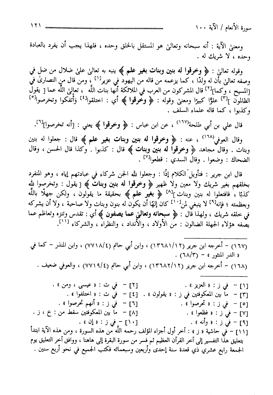 تَعَالَى اللَّه عَمَّا يَقُول الظَّالِمُونَ عُلُوًّا كَبِيرًا وَمَعْنَى خَرَقُوا أَيْ اِخْتَلَقُوا وَائْتَفَكُوا وَتَخَرَّصُوا وَكَذَبُوا كَمَا قَالَهُ عُلَمَاء السَّلَف قَالَ عَلِيّ بْن أَبِي طَلْحَة وَابْن عَبَّاس وَخَرَقُوا يَعْنِي تَخَرَّصُوا وَقَالَ الْعَوْفِيّ عَنْهُ " وَخَرَقُوا لَهُ بَنِينَ وَبَنَات بِغَيْرِ عِلْم " قَالَ جَعَلُوا لَهُ بَنِينَ وَبَنَات وَقَالَ مُجَاهِد " وَخَرَقُوا لَهُ بَنِينَ وَبَنَات " قَالَ كَذَبُوا .