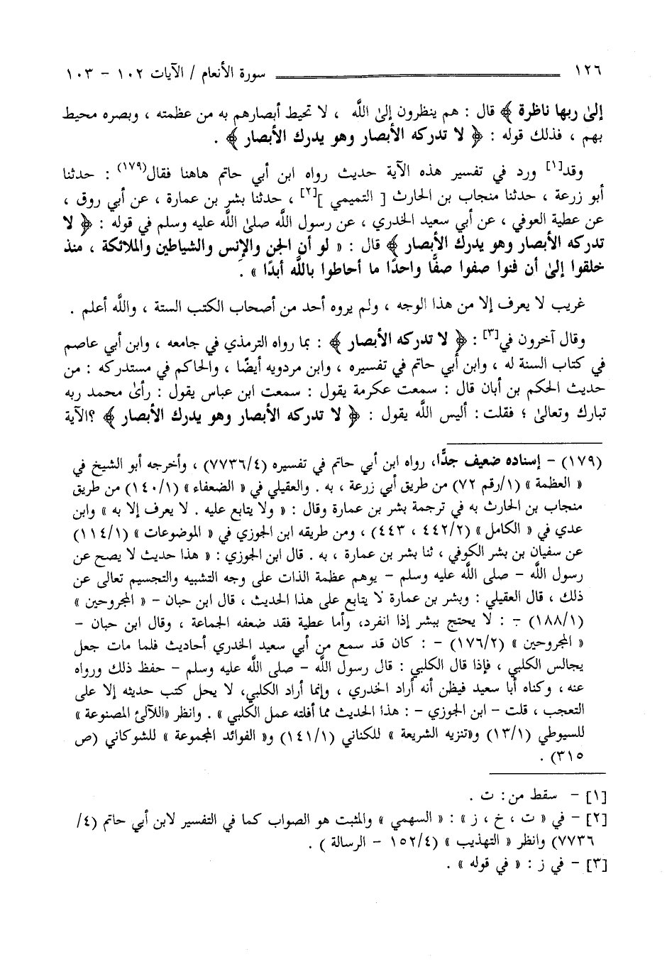 إِلَى رَبّهَا نَاظِرَة " قَالَ هُمْ يَنْظُرُونَ إِلَى اللَّه لَا تُحِيط أَبْصَارهمْ بِهِ مِنْ عَظَمَته وَبَصَره مُحِيط بِهِمْ فَذَلِكَ قَوْله " لَا تُدْرِكهُ الْأَبْصَار وَهُوَ يُدْرِك الْأَبْصَار " وَوَرَدَ فِي تَفْسِير هَذِهِ الْآيَة حَدِيث رَوَاهُ اِبْن أَبِي حَاتِم هَهُنَا فَقَالَ حَدَّثَنَا أَبُو زُرْعَة حَدَّثَنَا مِنْجَاب بْن الْحَارِث السَّهْمِيّ حَدَّثَنَا بِشْر بْن عُمَارَة عَنْ أَبِي رَوْق عَنْ عَطِيَّة الْعَوْفِيّ عَنْ أَبِي سَعِيد الْخُدْرِيّ عَنْ رَسُول اللَّه صَلَّى اللَّه عَلَيْهِ وَآله وَسَلَّمَ فِي قَوْله" لَا تُدْرِكهُ الْأَبْصَار وَهُوَ يُدْرِك الْأَبْصَار " قَالَ " لَوْ أَنَّ الْجِنّ وَالْإِنْس وَالشَّيَاطِين وَالْمَلَائِكَة مُنْذُ خُلِقُوا إِلَى أَنْ فَنَوْا صُفُّوا صَفًّا وَاحِدًا مَا أَحَاطُوا بِاَللَّهِ أَبَدًا " غَرِيب لَا يُعْرَف إِلَّا مِنْ هَذَا الْوَجْه وَلَمْ يَرْوِهِ أَحَد مِنْ أَصْحَاب الْكُتُب السِّتَّة وَاَللَّه أَعْلَم .
