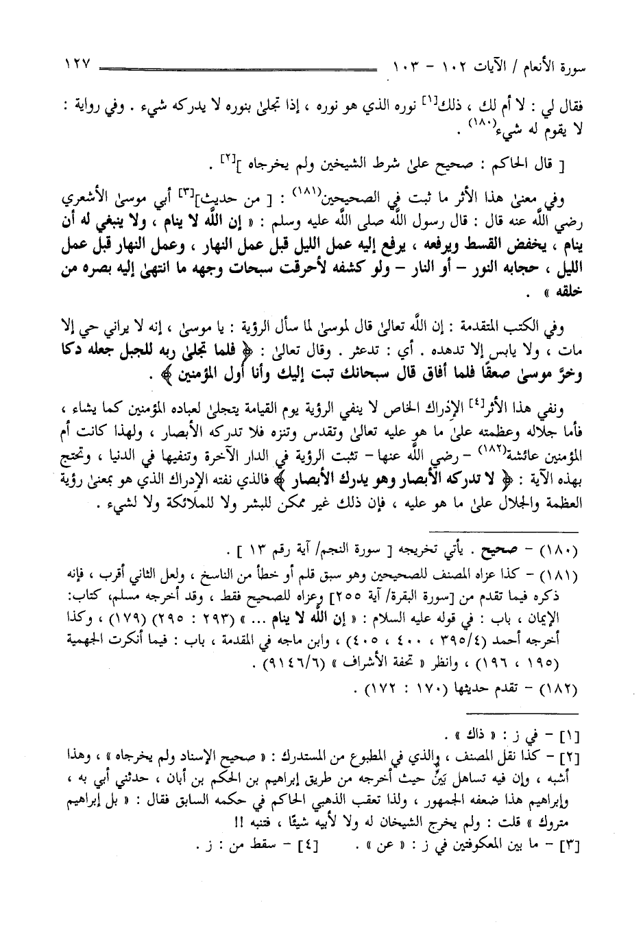 فَقَالَ لِي لَا أُمّ لَك ذَلِكَ نُوره الَّذِي هُوَ نُوره إِذَا تَجَلَّى بِنُورِهِ لَا يُدْرِكهُ شَيْء وَفِي رِوَايَة لَا يَقُوم لَهُ شَيْء قَالَ الْحَاكِم صَحِيح عَلَى شَرْط الشَّيْخَيْنِ وَلَمْ يُخَرِّجَاهُ وَفِي مَعْنَى هَذَا الْأَثَر مَا ثَبَتَ فِي الصَّحِيحَيْنِ مِنْ حَدِيث أَبِي مُوسَى الْأَشْعَرِيّ رَضِيَ اللَّه عَنْهُ مَرْفُوعًا إِنَّ اللَّه لَا يَنَام وَلَا يَنْبَغِي لَهُ أَنْ يَنَام يَخْفِض الْقِسْط وَيَرْفَعهُ يَرْفَع إِلَيْهِ عَمَل النَّهَار قَبْل اللَّيْل وَعَمَل اللَّيْل قَبْل النَّهَار حِجَابه النُّور - أَوْ النَّار - لَوْ كَشَفَهُ لَأَحْرَقَتْ سُبُحَات وَجْهه مَا اِنْتَهَى إِلَيْهِ بَصَره مِنْ خَلْقه وَفِي الْكُتُب الْمُتَقَدِّمَة إِنَّ اللَّه تَعَالَى قَالَ لِمُوسَى لَمَّا سَأَلَ الرُّؤْيَة : يَا مُوسَى إِنَّهُ لَا يَرَانِي حَيّ إِلَّا مَاتَ وَلَا يَابِس إِلَّا تَدَهْدَهَ .