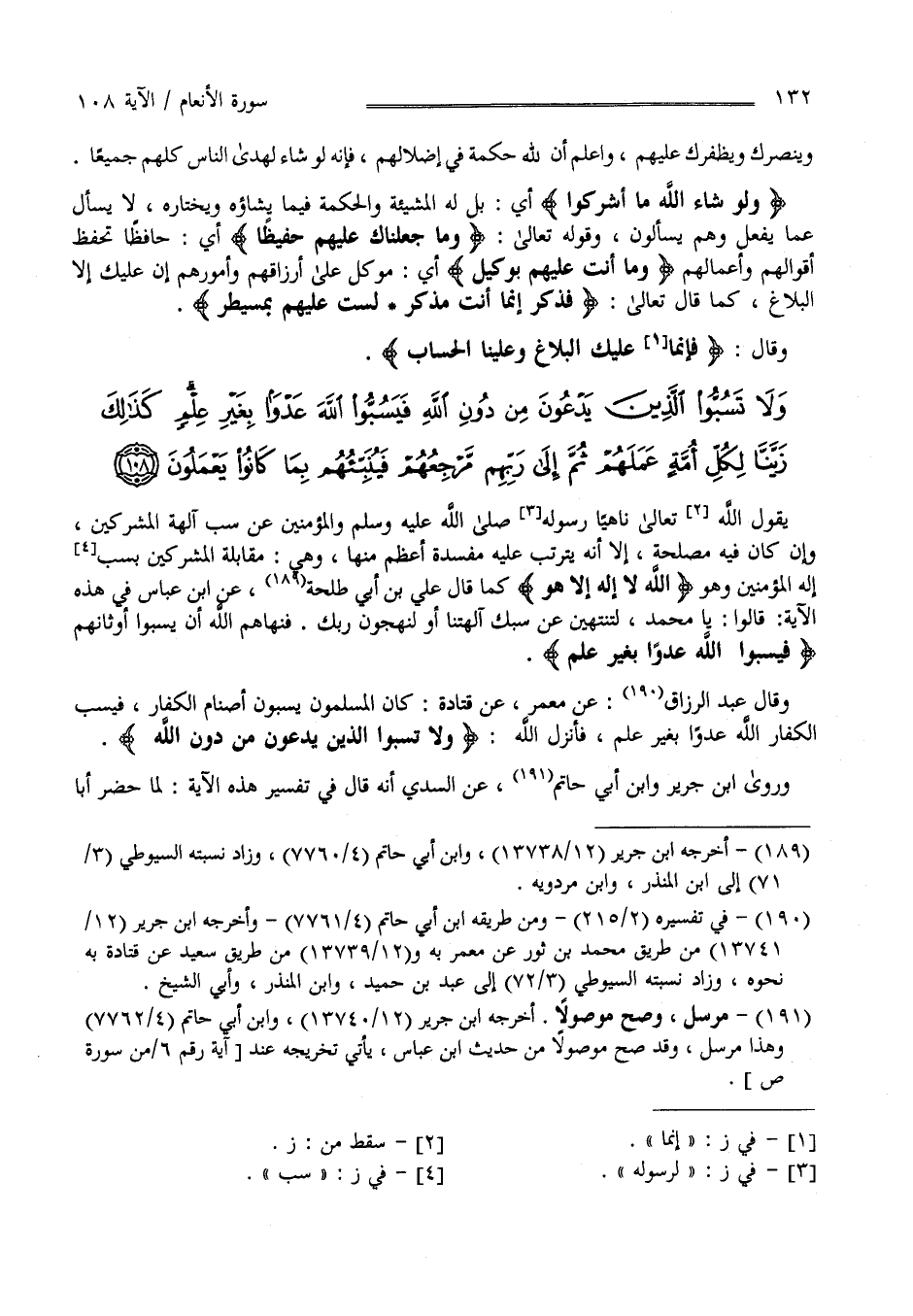 وَلَا تَسُبُّوا الَّذِينَ يَدْعُونَ مِنْ دُونِ اللَّهِ فَيَسُبُّوا اللَّهَ عَدْوًا بِغَيْرِ عِلْمٍ كَذَلِكَ زَيَّنَّا لِكُلِّ أُمَّةٍ عَمَلَهُمْ ثُمَّ إِلَى رَبِّهِمْ مَرْجِعُهُمْ فَيُنَبِّئُهُمْ بِمَا كَانُوا يَعْمَلُونَ (108)