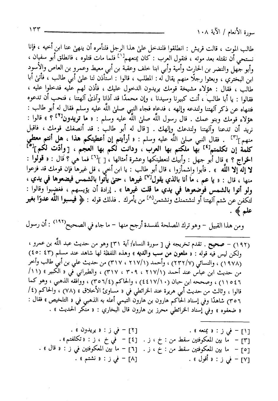 فَإِنَّ قَوْمك قَدْ فَزِعُوا مِنْهَا قَالَ يَا عَمّ مَا أَنَا بِاَلَّذِي يَقُول غَيْرهَا حَتَّى يَأْتُوا بِالشَّمْسِ فَيَضَعُوهَا فِي يَدِي وَلَوْ أَتَوْا بِالشَّمْسِ فَوَضَعُوهَا فِي يَدِي مَا قُلْت غَيْرهَا إِرَادَة أَنْ يُؤَيِّسهُمْ فَغَضِبُوا وَقَالُوا لَتَكُفَّنَّ عَنْ شَتْم آلِهَتنَا أَوْ لَنَشْتُمَنَّكَ وَنَشْتُمَنَّ مَنْ يَأْمُرك فَذَلِكَ قَوْله " فَيَسُبُّوا اللَّه عَدْوًا بِغَيْرِ عِلْم " وَمِنْ هَذَا الْقَبِيل وَهُوَ تَرْك الْمَصْلَحَة لِمَفْسَدَةٍ أَرْجَح مِنْهَا مَا جَاءَ فِي الصَّحِيح أَنَّ رَسُول