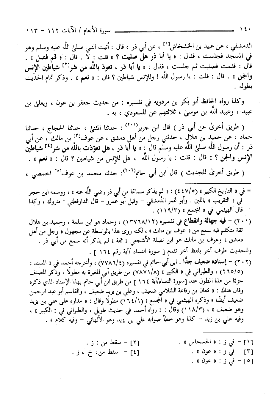 " طَرِيق أُخْرَى عَنْ أَبِي ذَرّ " قَالَ اِبْن جَرِير حَدَّثَنَا الْمُثَنَّى حَدَّثَنَا الْحَجَّاج حَدَّثَنَا حَمَّاد عَنْ حُمَيْد بْن هِلَال حَدَّثَنِي رَجُل مِنْ أَهْل دِمَشْق عَنْ عَوْف بْن مَالِك عَنْ أَبِي ذَرّ أَنَّ رَسُول اللَّه صَلَّى اللَّه عَلَيْهِ وَسَلَّمَ قَالَ يَا أَبَا ذَرّ هَلْ تَعَوَّذْت بِاَللَّهِ مِنْ شَرّ شَيَاطِين الْإِنْس وَالْجِنّ ؟ قَالَ : قُلْت يَا رَسُول اللَّه هَلْ لِلْإِنْسِ مِنْ شَيَاطِين ؟ قَالَ : نَعَمْ .