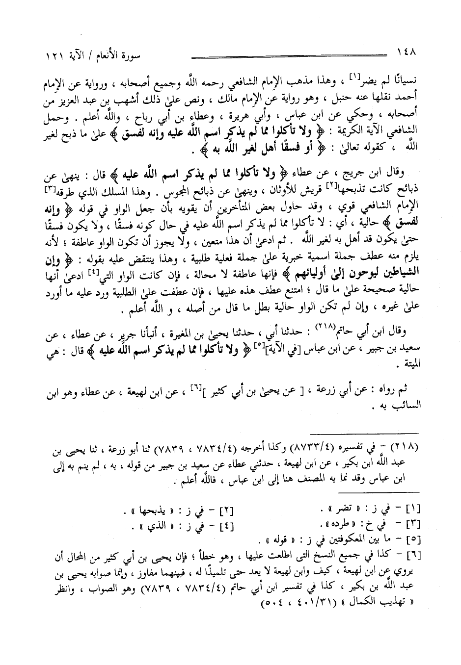 ثُمَّ اِدَّعَى أَنَّ هَذَا مُتَعَيِّن وَلَا يَجُوز أَنْ تَكُون الْوَاو عَاطِفَة لِأَنَّهُ يَلْزَم مِنْهُ عَطْف جُمْلَة إِسْمِيَّة خَبَرِيَّة عَلَى جَمَله فِعْلِيَّة طَلَبِيَّة وَهَذَا يُنْتَقَض عَلَيْهِ بِقَوْلِهِ" وَإِنَّ الشَّيَاطِين لَيُوحُونَ إِلَى أَوْلِيَائِهِمْ " فَإِنَّهَا عَاطِفَة لَا مُحَاوِلَة فَإِنْ كَانَتْ الْوَاو الَّتِي اِدَّعَى أَنَّهَا حَالِيَّة صَحِيحَة عَلَى مَا قَالَ اِمْتَنَعَ عَطْف هَذِهِ عَلَيْهَا فَإِنْ عُطِفَتْ عَلَى الطَّلَبِيَّة وَرَدَّ عَلَيْهِ مَا أَوْرَدَ عَلَى غَيْره وَإِنْ لَمْ تَكُنْ الْوَاو حَالِيَّة بَطَلَ مَا قَالَ مِنْ أَصْله وَاَللَّه أَعْلَم وَقَالَ اِبْن أَبِي حَاتِم : حَدَّثَنَا أَبِي حَدَّثَنَا يَحْيَى بْن الْمُغِيرَة أَنْبَأَنَا جَرِير عَنْ عَطَاء عَنْ سَعِيد بْن جُبَيْر عَنْ اِبْن عَبَّاس فِي الْآيَة " وَلَا تَأْكُلُوا مِمَّا لَمْ يُذْكَر اِسْم اللَّه عَلَيْهِ " قَالَ هِيَ الْمَيْتَة.