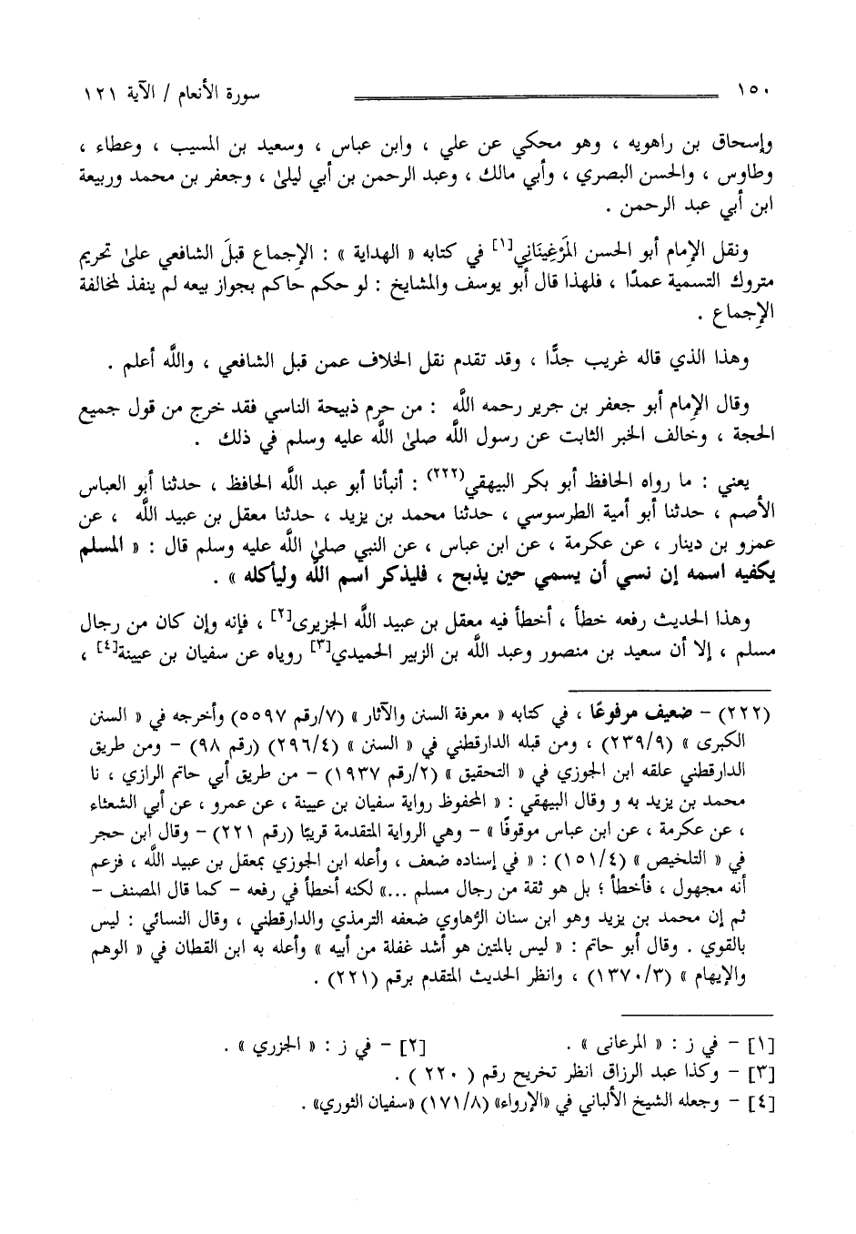 وَقَالَ الْإِمَام أَبُو جَعْفَر بْن جَرِير رَحِمَهُ اللَّه مَنْ حَرَّمَ ذَبِيحَة النَّاسِي فَقَدْ خَرَجَ مِنْ قَوْل جَمِيع الْحُجَّة وَخَالَفَ الْخَبَر الثَّابِت عَنْ رَسُول اللَّه صَلَّى اللَّه عَلَيْهِ وَسَلَّمَ فِي ذَلِكَ يَعْنِي مَا رَوَاهُ الْحَافِظ أَبُو بَكْر الْبَيْهَقِيّ أَنْبَأَنَا أَبُو عَبْد اللَّه الْحَافِظ حَدَّثَنَا أَبُو الْعَبَّاس الْأَصَمّ حَدَّثَنَا أَبُو أُمَيَّة الطَّرَسُوسِيّ حَدَّثَنَا مُحَمَّد بْن يَزِيد حَدَّثَنَا مَعْقِل بْن عُبَيْد اللَّه عَنْ عَمْرو بْن دِينَار عَنْ عِكْرِمَة عَنْ اِبْن عَبَّاس عَنْ النَّبِيّ صَلَّى اللَّه عَلَيْهِ وَسَلَّمَ قَالَ الْمُسْلِم يَكْفِيه اِسْمه إِنْ نَسِيَ أَنْ يُسَمِّي حِين يَذْبَح فَلْيَذْكُرْ اِسْم اللَّه وَلْيَأْكُلْهُ وَهَذَا الْحَدِيث رَفَعَهُ خَطَأ أَخْطَأَ فِيهِ مَعْقِل بْن عُبَيْد اللَّه الْجَزَرِيّ فَإِنَّهُ وَإِنْ كَانَ مِنْ رِجَال مُسْلِم إِلَّا أَنَّ سَعِيد بْن مَنْصُور وَعَبْد اللَّه بْن الزُّبَيْر الْحُمَيْدِيّ رَوَيَاهُ عَنْ سُفْيَان بْن عُيَيْنَة