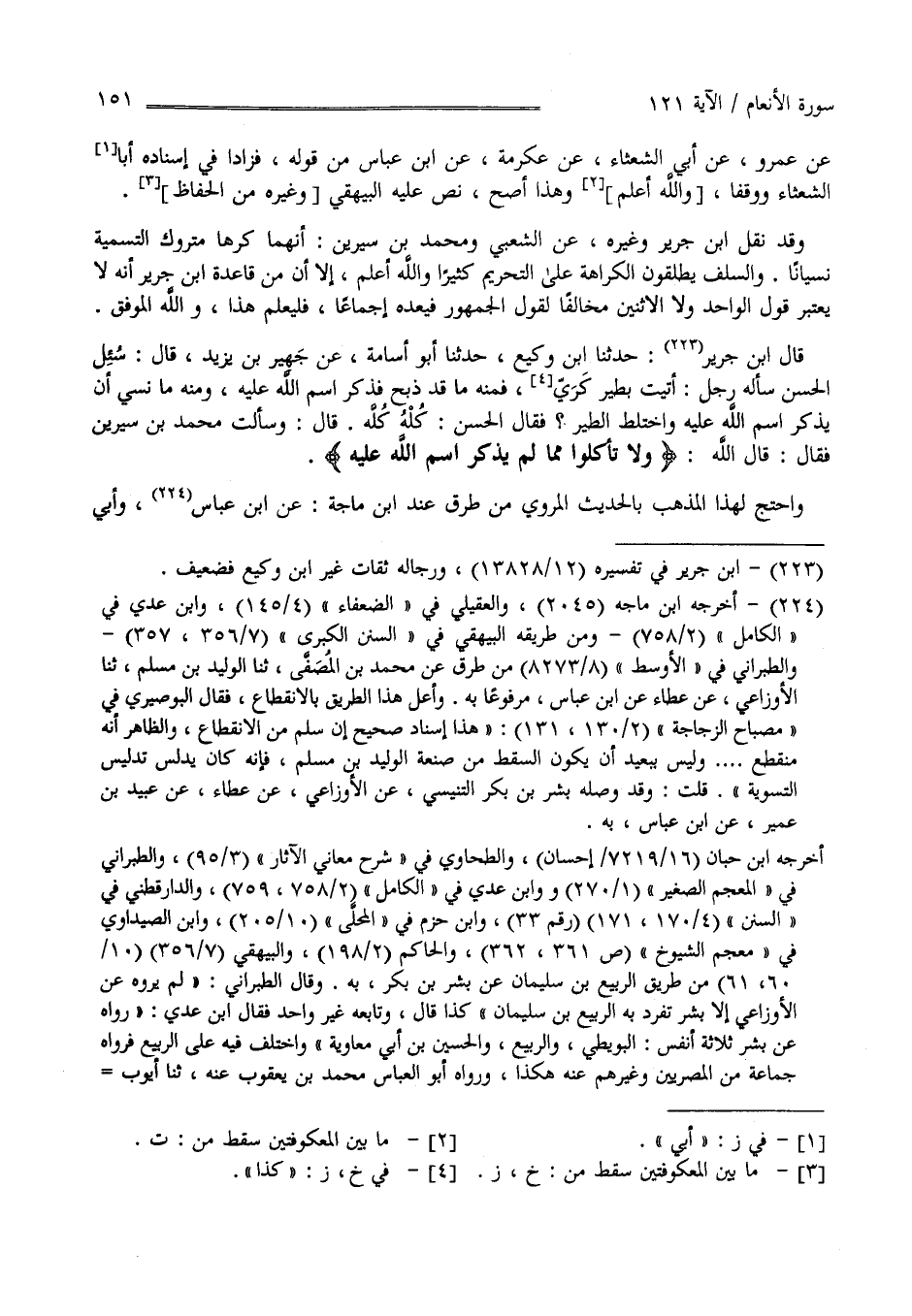 عَنْ عَمْرو عَنْ أَبِي الشَّعْثَاء عَنْ عِكْرِمَة عَنْ اِبْن عَبَّاس مِنْ قَوْله فَزَادَا فِي إِسْنَاده أَبَا الشَّعْثَاء وَوَثَّقَاهُ وَهَذَا أَصَحّ نَصَّ عَلَيْهِ الْبَيْهَقِيّ وَغَيْره مِنْ الْحُفَّاظ ثُمَّ نَقَلَ اِبْن جَرِير وَغَيْره عَنْ الشَّعْبِيّ وَمُحَمَّد بْن سِيرِينَ أَنَّهُمَا كَرِهَا مَتْرُوك التَّسْمِيَة نِسْيَانًا وَالسَّلَف يُطْلِقُونَ الْكَرَاهِيَة عَلَى التَّحْرِيم كَثِيرًا وَاَللَّه أَعْلَم إِلَّا أَنَّ مِنْ قَاعِدَة اِبْن جَرِير أَنَّهُ لَا يَعْتَبِر قَوْل الْوَاحِد وَلَا الِاثْنَيْنِ مُخَالِفًا لِقَوْلِ الْجُمْهُور فَيَعُدّهُ إِجْمَاعًا فَلْيُعْلَمْ هَذَا وَاَللَّه الْمُوَفِّق قَالَ اِبْن جَرِير : حَدَّثَنَا اِبْن وَكِيع حَدَّثَنَا أَبُو أُسَامَة عَنْ جُبَيْر بْن يَزِيد قَالَ : سُئِلَ الْحَسَن سَأَلَهُ رَجُل أُتِيت بِطَيْرِ كَذَا فَمِنْهُ مَا قَدْ ذُبِحَ فَذُكِرَ اِسْم اللَّه عَلَيْهِ وَمِنْهُ مَا نُسِيَ أَنْ يُذْكَر اِسْم اللَّه عَلَيْهِ وَاخْتَلَطَ الطَّيْر فَقَالَ الْحَسَن كُلّه كُلّه قَالَ وَسَأَلْت مُحَمَّد بْن سِيرِينَ فَقَالَ : قَالَ اللَّه " وَلَا تَأْكُلُوا مِمَّا لَمْ يُذْكَر اِسْم اللَّه عَلَيْهِ " وَاحْتَجَّ لِهَذَا الْمَذْهَب بِالْحَدِيثِ الْمَرْوِيّ مِنْ طُرُق عِنْد اِبْن مَاجَهْ عَنْ اِبْن عَبَّاس وَأَبِي