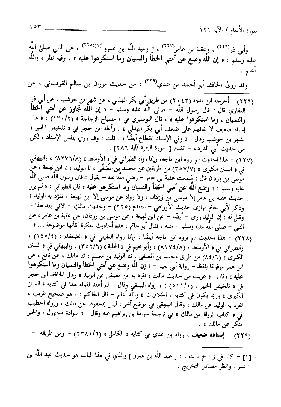 وَأَبِي ذَرّ وَعُقْبَة بْن عَامِر وَعَبْد اللَّه بْن عَمْرو عَنْ النَّبِيّ صَلَّى اللَّه عَلَيْهِ وَسَلَّمَ إِنَّ اللَّه وَضَعَ عَنْ أُمَّتِي الْخَطَأ وَالنِّسْيَان وَمَا اُسْتُكْرِهُوا عَلَيْهِ وَفِيهِ نَظَر وَاَللَّه أَعْلَم وَقَدْ رَوَى الْحَافِظ أَبُو أَحْمَد بْن عَدِيّ مِنْ حَدِيث مَرْوَان بْن سَالِم الْقَرْقَسَانِيّ عَنْ