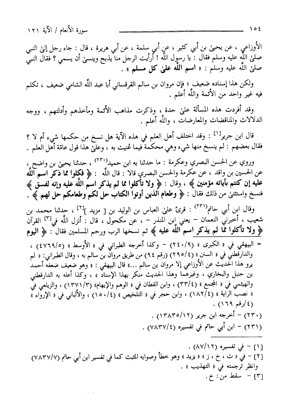 الْأَوْزَاعِيّ عَنْ يَحْيَى بْن أَبِي كَثِير عَنْ أَبِي سَلَمَة عَنْ أَبِي هُرَيْرَة قَالَ جَاءَ رَجُل إِلَى النَّبِيّ صَلَّى اللَّه عَلَيْهِ وَسَلَّمَ فَقَالَ : يَا رَسُول اللَّه أَرَأَيْت الرَّجُل مِنَّا يَذْبَح وَيَنْسَى أَنْ يُسَمِّي ؟ فَقَالَ النَّبِيّ صَلَّى اللَّه عَلَيْهِ وَسَلَّمَ اِسْم اللَّه عَلَى كُلّ مُسْلِم وَلَكِنْ هَذَا إِسْنَاده ضَعِيف فَإِنَّ مَرْوَان بْن سَالِم الْقَرْقَسَانِيّ أَبَا عَبْد اللَّه الشَّامِيّ ضَعِيف تَكَلَّمَ فِيهِ غَيْر وَاحِد مِنْ الْأَئِمَّة وَاَللَّه أَعْلَم وَقَدْ أَفْرَدْت هَذِهِ الْمَسْأَلَة عَلَى حِدَة وَذَكَرْت