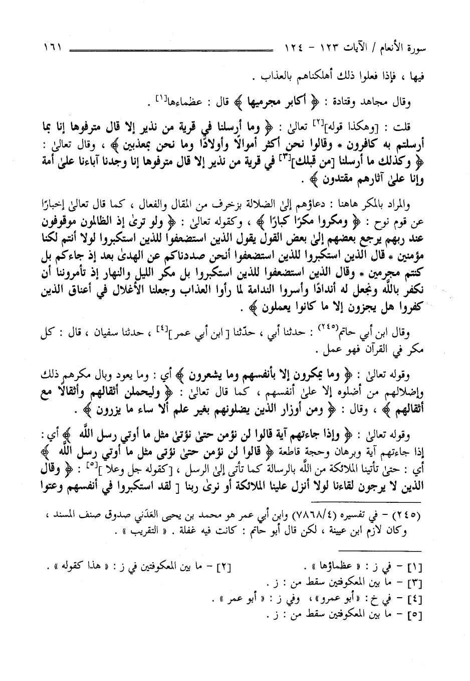 وَقَالَ مُجَاهِد وَقَتَادَة " أَكَابِر مُجْرِمِيهَا " عُظَمَاؤُهَا قُلْت : وَهَكَذَا قَوْله تَعَالَى " وَمَا أَرْسَلْنَا فِي قَرْيَة مِنْ نَذِير إِلَّا قَالَ مُتْرَفُوهَا إِنَّا بِمَا أُرْسِلْتُمْ بِهِ كَافِرُونَ وَقَالُوا نَحْنُ أَكْثَر أَمْوَالًا وَأَوْلَادًا وَمَا نَحْنُ بِمُعَذَّبِينَ" وَقَالَ تَعَالَى " وَكَذَلِكَ مَا أَرْسَلْنَا مِنْ قَبْلك فِي قَرْيَة مِنْ نَذِير إِلَّا قَالَ مُتْرَفُوهَا إِنَّا وَجَدْنَا آبَاءَنَا عَلَى أُمَّة وَإِنَّا عَلَى آثَارهمْ مُقْتَدُونَ " وَالْمُرَاد بِالْمَكْرِ هَهُنَا دُعَاؤُهُمْ إِلَى الضَّلَالَة بِزُخْرُفٍ مِنْ الْمَقَال وَالْفِعَال كَقَوْلِهِ تَعَالَى إِخْبَارًا عَنْ قَوْم نُوح " وَمَكَرُوا مَكْرًا كُبَّارًا " وَكَقَوْلِهِ تَعَالَى " وَلَوْ تَرَى إِذْ الظَّالِمُونَ مَوْقُوفُونَ عِنْد رَبّهمْ يَرْجِع بَعْضهمْ إِلَى بَعْض الْقَوْل يَقُول الَّذِينَ اُسْتُضْعِفُوا لِلَّذِينَ اِسْتَكْبَرُوا لَوْلَا أَنْتُمْ لَكُنَّا مُؤْمِنِينَ قَالَ الَّذِينَ اِسْتَكْبَرُوا لِلَّذِينَ اُسْتُضْعِفُوا أَنَحْنُ صَدَدْنَاكُمْ عَنْ الْهُدَى بَعْد إِذْ جَاءَكُمْ بَلْ كُنْتُمْ مُجْرِمِينَ وَقَالَ الَّذِينَ اُسْتُضْعِفُوا لِلَّذِينَ اِسْتَكْبَرُوا بَلْ مَكْر اللَّيْل وَالنَّهَار إِذْ تَأْمُرُونَنَا أَنْ نَكْفُر بِاَللَّهِ وَنَجْعَل لَهُ أَنْدَادًا " الْآيَة وَقَالَ اِبْن أَبِي حَاتِم : حَدَّثَنَا أَبِي حَدَّثَنَا اِبْن أَبِي عُمَر حَدَّثَنَا سُفْيَان قَالَ : كُلّ مَكْر فِي الْقُرْآن فَهُوَ عَمَل وَقَوْله تَعَالَى " وَمَا يَمْكُرُونَ إِلَّا بِأَنْفُسِهِمْ وَمَا يَشْعُرُونَ " أَيْ وَمَا يَعُود وَبَال مَكْرهمْ ذَلِكَ وَإِضْلَالهمْ مَنْ أَضَلُّوهُ إِلَّا عَلَى أَنْفُسهمْ كَمَا قَالَ تَعَالَى " وَلَيَحْمِلُنَّ أَثْقَالهمْ وَأَثْقَالًا مَعَ أَثْقَالهمْ " وَقَالَ " وَمِنْ أَوْزَار الَّذِينَ يُضِلُّونَهُمْ بِغَيْرِ عِلْم أَلَا سَاءَ مَا يَزِرُونَ " .