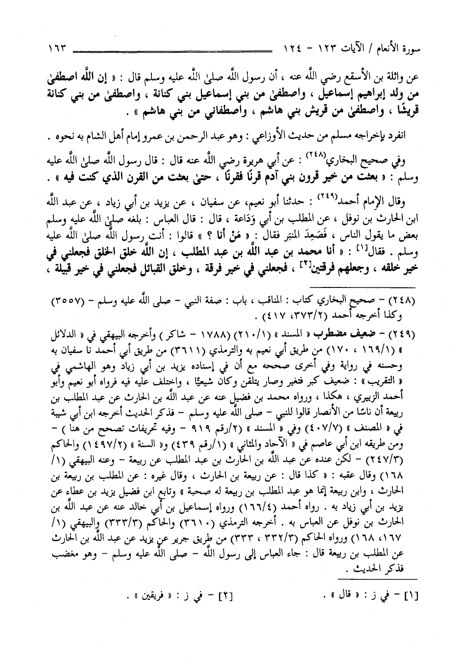 عَنْ وَاثِلَة بْن الْأَسْقَع رَضِيَ اللَّه عَنْهُ أَنَّ رَسُول اللَّه صَلَّى اللَّه عَلَيْهِ وَآله وَسَلَّمَ قَالَ إِنَّ اللَّه اِصْطَفَى مِنْ وَلَد إِبْرَاهِيم إِسْمَاعِيل وَاصْطَفَى مِنْ بَنِي إِسْمَاعِيل بَنِي كِنَانَة وَاصْطَفَى مِنْ بَنِي كِنَانَة قُرَيْشًا وَاصْطَفَى مِنْ قُرَيْش بَنِي هَاشِم وَاصْطَفَانِي مِنْ بَنِي هَاشِم اِنْفَرَدَ بِإِخْرَاجِهِ مُسْلِم مِنْ حَدِيث الْأَوْزَاعِيّ وَهُوَ عَبْد الرَّحْمَن بْن عَمْرو إِمَام أَهْل الشَّام بِهِ نَحْوه وَفِي صَحِيح الْبُخَارِيّ عَنْ أَبِي هُرَيْرَة رَضِيَ اللَّه عَنْهُ قَالَ : قَالَ رَسُول اللَّه صَلَّى اللَّه عَلَيْهِ وَسَلَّمَ بُعِثْت مِنْ خَيْر قُرُون بَنِي آدَم قَرْنًا فَقَرْنًا حَتَّى بُعِثْت مِنْ الْقَرْن الَّذِي كُنْت فِيهِ وَقَالَ الْإِمَام أَحْمَد : حَدَّثَنَا أَبُو نُعَيْم عَنْ سُفْيَان عَنْ يَزِيد بْن أَبِي زِيَاد