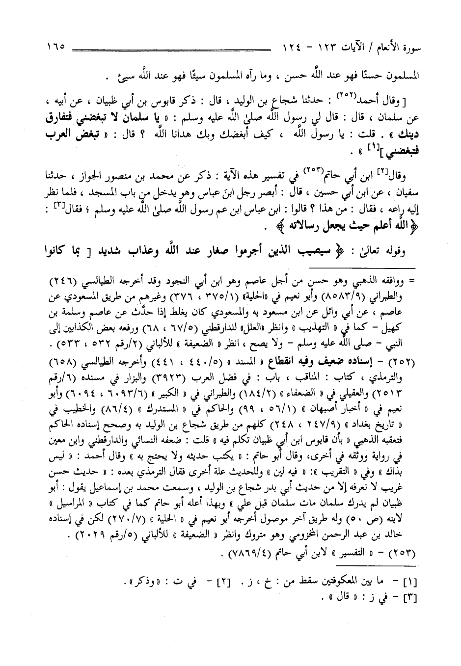 وَقَالَ أَحْمَد : حَدَّثَنَا شُجَاع بْن الْوَلِيد قَالَ : ذَكَرَ قَابُوس بْن أَبِي ظَبْيَان عَنْ أَبِيهِ عَنْ سَلْمَان قَالَ : قَالَ لِي رَسُول اللَّه صَلَّى اللَّه عَلَيْهِ وَسَلَّمَ يَا سَلْمَان لَا تَبْغَضنِي فَتُفَارِق دِينك قُلْت يَا رَسُول اللَّه كَيْفَ أَبْغَضك وَبِك هَدَانَا اللَّه ؟ قَالَ تَبْغَض الْعَرَب فَتَبْغَضنِي وَذَكَرَ اِبْن أَبِي حَاتِم فِي تَفْسِير هَذِهِ الْآيَة ذَكَرَ عَنْ مُحَمَّد بْن مَنْصُور الْجَوَاز حَدَّثَنَا سُفْيَان عَنْ أَبِي حُسَيْن قَالَ : أَبْصَرَ رَجُل اِبْن عَبَّاس وَهُوَ دَاخِل مِنْ بَاب الْمَسْجِد فَلَمَّا نَظَرَ إِلَيْهِ رَاعَهُ فَقَالَ مَنْ هَذَا قَالُوا اِبْن عَبَّاس اِبْن عَمّ رَسُول اللَّه صَلَّى اللَّه عَلَيْهِ وَسَلَّمَ فَقَالَ " اللَّه أَعْلَم حَيْثُ يَجْعَل رِسَالَته" وَقَوْله تَعَالَى " سَيُصِيبُ الَّذِينَ أَجْرَمُوا صَغَار عِنْد اللَّه وَعَذَاب شَدِيد " الْآيَة
