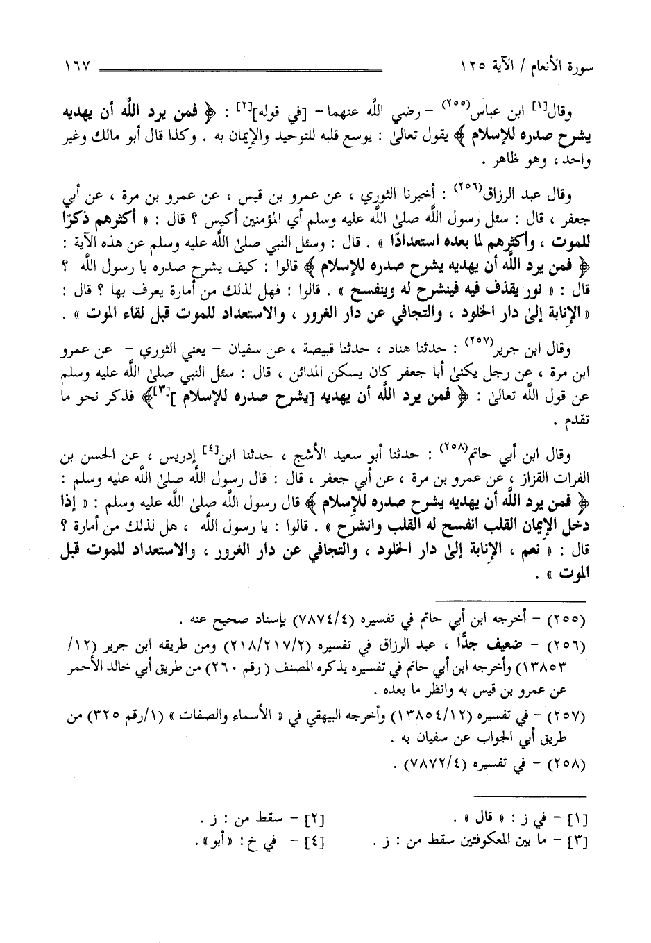 " وَقَالَ اِبْن عَبَّاس فِي قَوْله " فَمَنْ يُرِدْ اللَّه أَنْ يَهْدِيه يَشْرَح صَدْره لِلْإِسْلَامِ" يَقُول تَعَالَى يُوَسِّع قَلْبه لِلتَّوْحِيدِ وَالْإِيمَان بِهِ وَكَذَا قَالَ أَبُو مَالِك وَغَيْر وَاحِد وَهُوَ ظَاهِر .