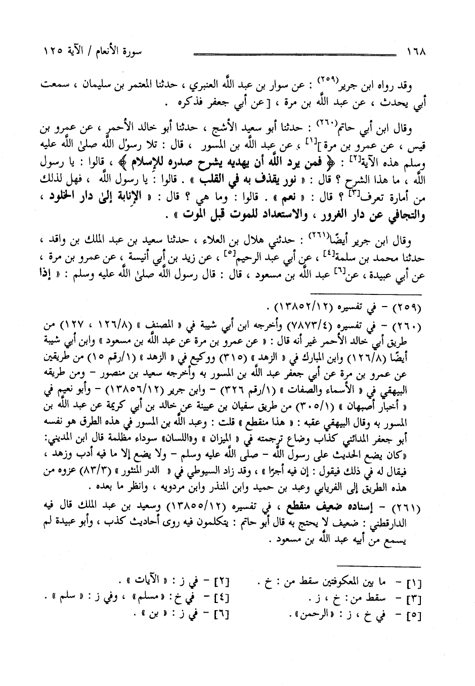 وَقَالَ اِبْن أَبِي حَاتِم : حَدَّثَنَا أَبُو سَعِيد الْأَشَجّ حَدَّثَنَا أَبُو خَالِد الْأَحْمَر عَنْ عَمْرو بْن قَيْس عَنْ عَمْرو بْن مُرَّة عَنْ عَبْد اللَّه بْن مَسْعُود قَالَ : تَلَا رَسُول اللَّه صَلَّى اللَّه عَلَيْهِ وَسَلَّمَ هَذِهِ الْآيَة " فَمَنْ يُرِدْ اللَّه أَنْ يَهْدِيه يَشْرَح صَدْره لِلْإِسْلَامِ " قَالُوا : يَا رَسُول اللَّه مَا هَذَا الشَّرْح ؟ قَالَ نُور يُقْذَف فِي الْقَلْب قَالُوا : يَا رَسُول اللَّه فَهَلْ لِذَلِكَ مِنْ أَمَارَة تُعْرَف ؟ قَالَ نَعَمْ قَالُوا : وَمَا هِيَ ؟ قَالَ : الْإِنَابَة إِلَى دَار الْخُلُود وَالتَّجَافِي عَنْ دَار الْغُرُور وَالِاسْتِعْدَاد لِلْمَوْتِ قَبْل الْمَوْت .
