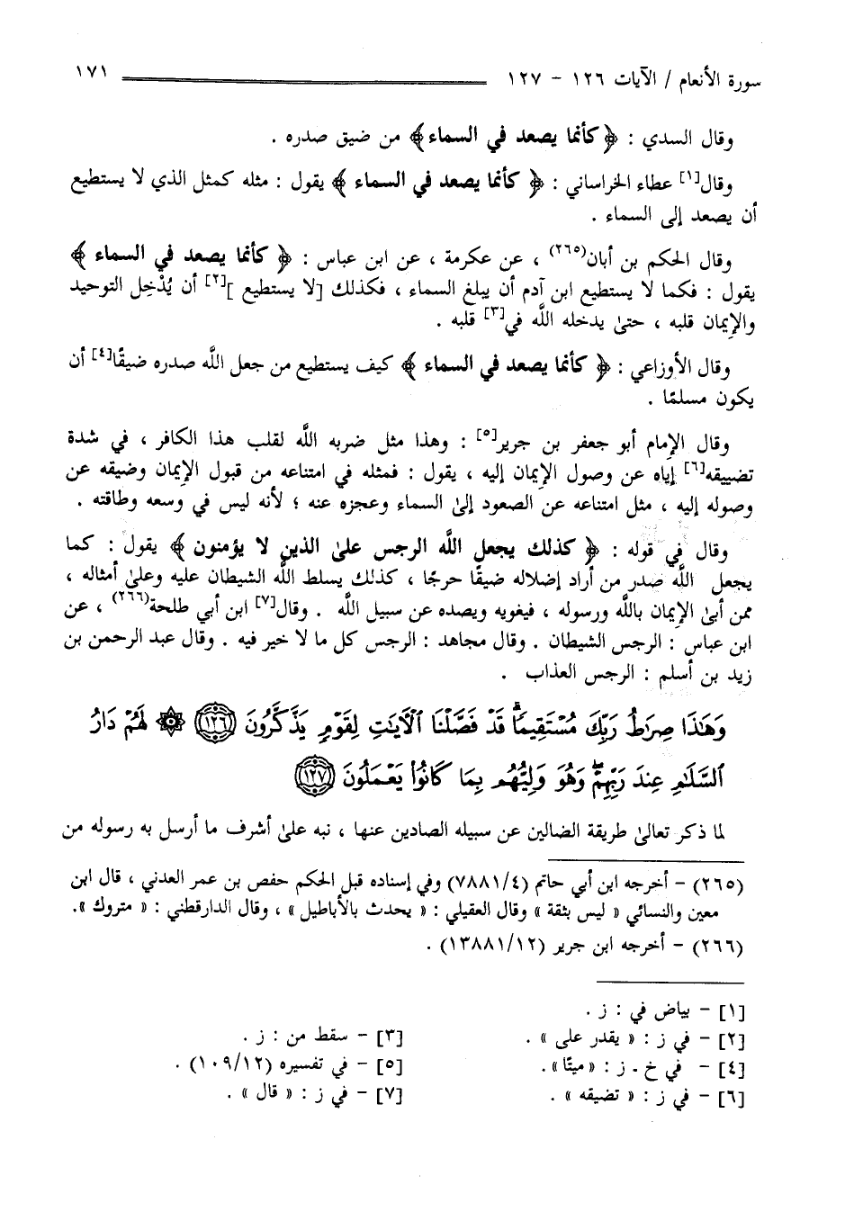 وَقَالَ الْإِمَام أَبُو جَعْفَر بْن جَرِير : وَهَذَا مَثَل ضَرَبَهُ اللَّه لِقَلْبِ هَذَا الْكَافِر فِي شِدَّة ضِيقه عَنْ وُصُول الْإِيمَان إِلَيْهِ يَقُول فَمَثَله فِي اِمْتِنَاعه مِنْ قَبُول الْإِيمَان وَضِيقه عَنْ وُصُوله إِلَيْهِ مَثَل اِمْتِنَاعه عَنْ الصُّعُود إِلَى السَّمَاء وَعَجْزه عَنْهُ لِأَنَّهُ لَيْسَ فِي وُسْعه وَطَاقَته وَقَالَ فِي قَوْله " كَذَلِكَ يَجْعَل اللَّه الرِّجْس عَلَى الَّذِينَ لَا يُؤْمِنُونَ" يَقُول كَمَا يَجْعَل اللَّه صَدْر مَنْ أَرَادَ إِضْلَاله ضَيِّقًا حَرَجًا كَذَلِكَ يُسَلِّط اللَّه الشَّيْطَان عَلَيْهِ وَعَلَى أَمْثَاله مِمَّنْ أَبَى الْإِيمَان بِاَللَّهِ وَرَسُوله فَيُغْوِيه وَيَصُدّهُ عَنْ سَبِيل اللَّه وَقَالَ اِبْن أَبِي طَلْحَة عَنْ اِبْن عَبَّاس : الرِّجْس الشَّيْطَان وَقَالَ مُجَاهِد : الرِّجْس كُلّ مَا لَا خَيْر فِيهِ وَقَالَ عَبْد الرَّحْمَن بْن زَيْد بْن أَسْلَم الرِّجْس الْعَذَاب.