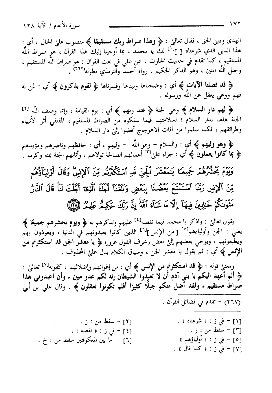 وَيَوْمَ يَحْشُرُهُمْ جَمِيعًا يَا مَعْشَرَ الْجِنِّ قَدِ اسْتَكْثَرْتُمْ مِنَ الْإِنْسِ وَقَالَ أَوْلِيَاؤُهُمْ مِنَ الْإِنْسِ رَبَّنَا اسْتَمْتَعَ بَعْضُنَا بِبَعْضٍ وَبَلَغْنَا أَجَلَنَا الَّذِي أَجَّلْتَ لَنَا قَالَ النَّارُ مَثْوَاكُمْ خَالِدِينَ فِيهَا إِلَّا مَا شَاءَ اللَّهُ إِنَّ رَبَّكَ حَكِيمٌ عَلِيمٌ (128)