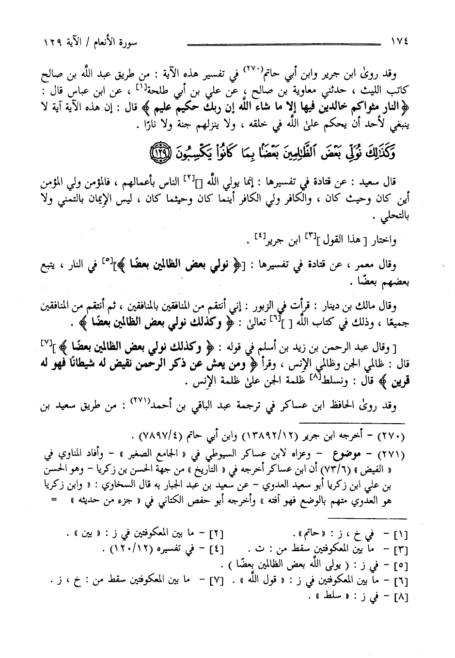 قَالَ سَعِيد عَنْ قَتَادَة فِي تَفْسِيرهَا إِنَّمَا يُوَلِّي اللَّه النَّاس أَعْمَالهمْ فَالْمُؤْمِن وَلِيّ الْمُؤْمِن أَيْنَ كَانَ وَحَيْثُ كَانَ وَالْكَافِر وَلِيّ الْكَافِر أَيْنَمَا كَانَ وَحَيْثُمَا كَانَ لَيْسَ الْإِيمَان بِالتَّمَنِّي وَلَا بِالتَّحَلِّي وَاخْتَارَهُ اِبْن جَرِير وَقَالَ مَعْمَر عَنْ قَتَادَة فِي تَفْسِير الْآيَة يُوَلِّي اللَّه بَعْض الظَّالِمِينَ بَعْضًا فِي النَّار يَتَّبِع بَعْضهمْ بَعْضًا وَقَالَ : مَالِك بْن دِينَار قَرَأْت فِي الزَّبُور إِنِّي أَنْتَقِم مِنْ الْمُنَافِقِينَ بِالْمُنَافِقِينَ ثُمَّ أَنْتَقِم مِنْ الْمُنَافِقِينَ جَمِيعًا وَذَلِكَ فِي كِتَاب اللَّه قَوْل اللَّه تَعَالَى " وَكَذَلِكَ نُوَلِّي بَعْضَ الظَّالِمِينَ بَعْضًا " وَقَالَ عَبْد الرَّحْمَن بْن زَيْد بْن أَسْلَم فِي قَوْله " وَكَذَلِكَ نُوَلِّي بَعْضَ الظَّالِمِينَ بَعْضًا " قَالَ ظَالِمِي الْجِنّ وَظَالِمِي الْإِنْس وَقَرَأَ " وَمَنْ يَعِشْ عَنْ ذِكْر الرَّحْمَن نُقَيِّض لَهُ شَيْطَانًا فَهُوَ لَهُ قَرِين " قَالَ وَنُسَلِّط ظَلَمَة الْجِنّ عَلَى ظَلَمَة الْإِنْس .
