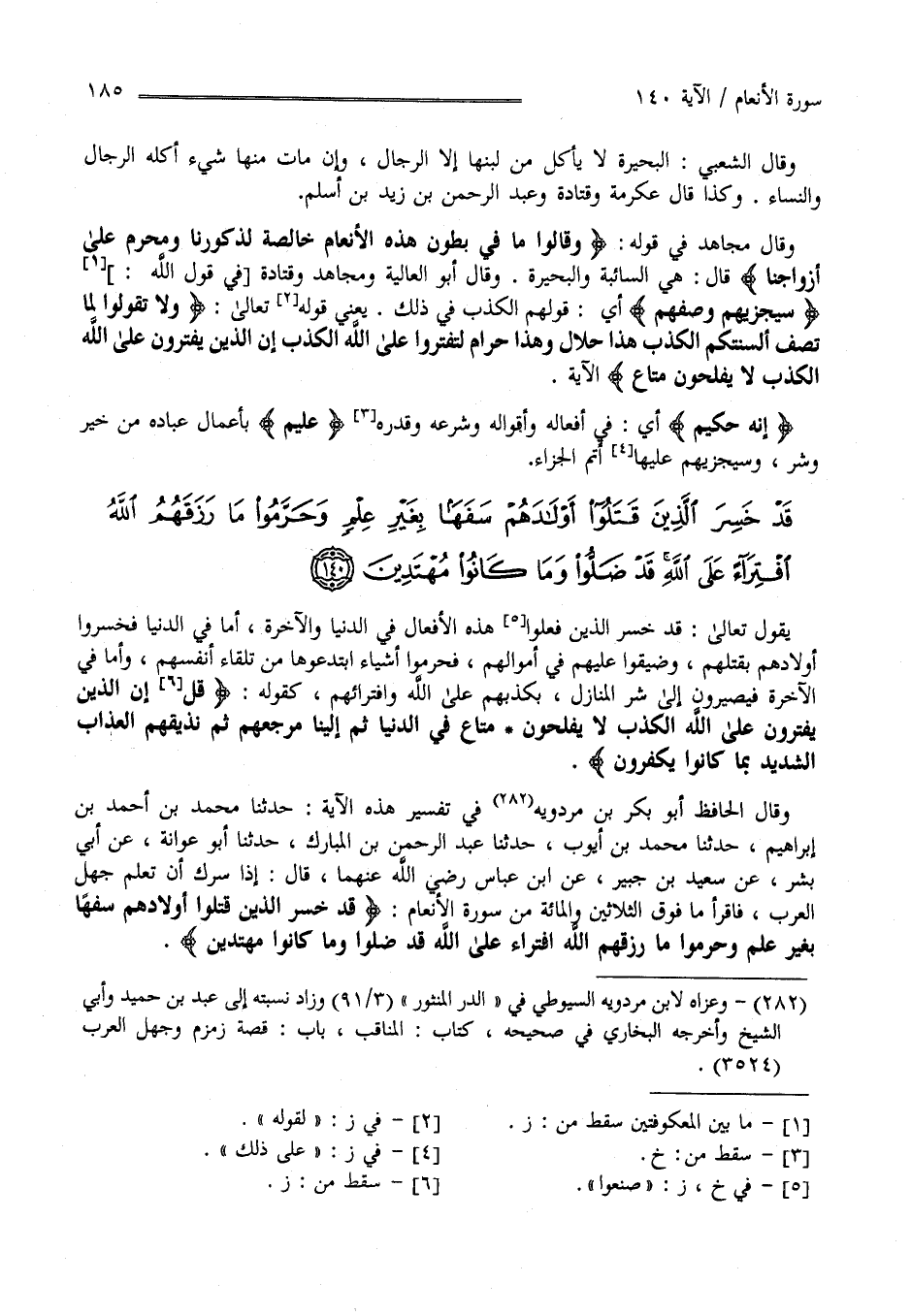 قَدْ خَسِرَ الَّذِينَ قَتَلُوا أَوْلَادَهُمْ سَفَهًا بِغَيْرِ عِلْمٍ وَحَرَّمُوا مَا رَزَقَهُمُ اللَّهُ افْتِرَاءً عَلَى اللَّهِ قَدْ ضَلُّوا وَمَا كَانُوا مُهْتَدِينَ يَقُول تَعَالَى : قَدْ خَسِرَ الَّذِينَ فَعَلُوا هَذِهِ الْأَفَاعِيل فِي الدُّنْيَا وَالْآخِرَة أَمَّا فِي الدُّنْيَا فَخَسِرُوا أَوْلَادهمْ بِقَتْلِهِمْ وَضَيَّقُوا عَلَيْهِمْ فِي أَمْوَالهمْ فَحَرَّمُوا أَشْيَاء اِبْتَدَعُوهَا مِنْ تِلْقَاء أَنْفُسهمْ وَأَمَّا فِي الْآخِرَة فَيَصِيرُونَ إِلَى أَسْوَأ الْمَنَازِل بِكَذِبِهِمْ عَلَى اللَّه وَافْتِرَائِهِمْ كَقَوْلِهِ " إِنَّ الَّذِينَ يَفْتَرُونَ عَلَى اللَّه الْكَذِب لَا يُفْلِحُونَ مَتَاع فِي الدُّنْيَا ثُمَّ إِلَيْنَا مَرْجِعهمْ ثُمَّ نُذِيقهُمْ الْعَذَاب الشَّدِيد بِمَا كَانُوا يَكْفُرُونَ " وَقَالَ الْحَافِظ أَبُو بَكْر بْن مَرْدُوَيْهِ فِي تَفْسِير هَذِهِ الْآيَة : حَدَّثَنَا مُحَمَّد بْن أَحْمَد بْن إِبْرَاهِيم حَدَّثَنَا مُحَمَّد بْن أَيُّوب حَدَّثَنَا عَبْد الرَّحْمَن بْن الْمُبَارَك حَدَّثَنَا أَبُو عَوَانَة عَنْ أَبِي بِشْر عَنْ سَعِيد بْن جُبَيْر عَنْ اِبْن عَبَّاس رَضِيَ اللَّه عَنْهُمَا قَالَ : إِذَا سَرَّك أَنْ تَعْلَم جَهْل الْعَرَب فَاقْرَأْ مَا فَوْق الثَّلَاثِينَ وَالْمِائَة مِنْ سُورَة الْأَنْعَام " قَدْ خَسِرَ الَّذِينَ قَتَلُوا أَوْلَادهمْ سَفَهًا بِغَيْرِ عِلْم وَحَرَّمُوا مَا رَزَقَهُمْ اللَّه اِفْتِرَاء عَلَى اللَّه قَدْ ضَلُّوا وَمَا كَانُوا مُهْتَدِينَ