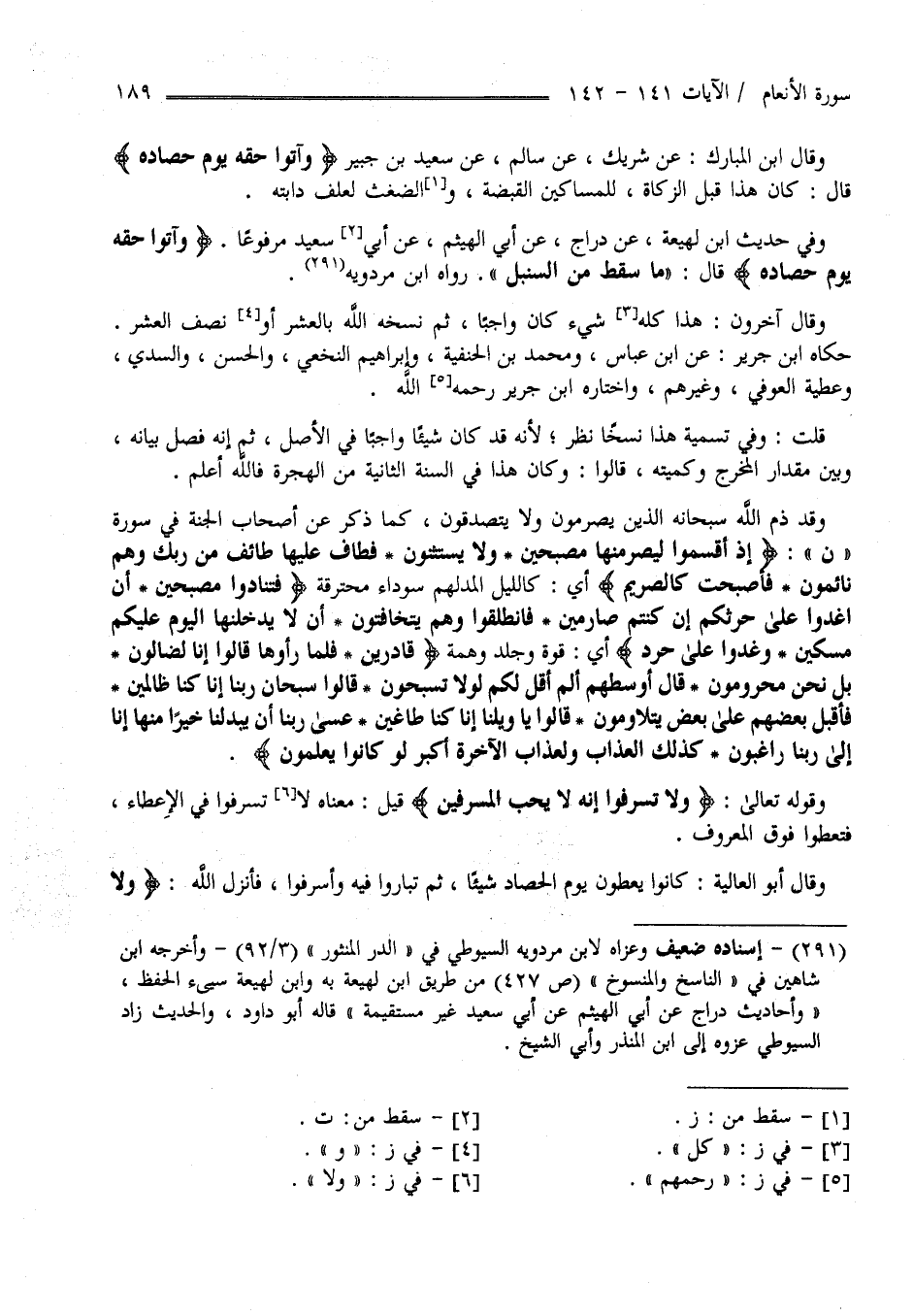 وَقَالَ اِبْن الْمُبَارَك عَنْ شَرِيك عَنْ سَالِم عَنْ سَعِيد بْن جُبَيْر " وَآتُوا حَقّه يَوْم حَصَاده " قَالَ : كَانَ هَذَا قَبْل الزَّكَاة لِلْمَسَاكِينِ الْقَبْضَة وَالضِّغْث لِعَلَفِ دَابَّته وَفِي حَدِيث اِبْن لَهِيعَة عَنْ دَرَّاج عَنْ أَبِي الْهَيْثَم عَنْ أَبِي سَعِيد مَرْفُوعًا " وَآتُوا حَقّه يَوْم حَصَاده" قَالَ : مَا سَقَطَ مِنْ السُّنْبُل رَوَاهُ اِبْن مَرْدُوَيْهِ وَقَالَ آخَرُونَ : هَذَا شَيْء كَانَ وَاجِبًا ثُمَّ نَسَخَهُ اللَّه بِالْعُشْرِ أَوْ نِصْف الْعُشْر حَكَاهُ اِبْن جَرِير عَنْ اِبْن عَبَّاس وَمُحَمَّد بْن الْحَنَفِيَّة وَإِبْرَاهِيم النَّخَعِيّ وَالْحَسَن وَالسُّدِّيّ وَعَطِيَّة الْعَوْفِيّ وَغَيْرهمْ وَاخْتَارَهُ اِبْن جَرِير رَحِمَهُ اللَّه قُلْت : وَفِي تَسْمِيَة هَذَا نَسْخًا نَظَر لِأَنَّهُ قَدْ كَانَ شَيْئًا وَاجِبًا فِي الْأَصْل ثُمَّ إِنْ فَصَّلَ بَيَانه وَبَيَّنَ مِقْدَار الْمُخْرَج وَكَمِّيَّته قَالُوا وَكَانَ هَذَا فِي السَّنَة الثَّانِيَة مِنْ الْهِجْرَة فَاَللَّه أَعْلَم وَقَدْ ذَمَّ اللَّه سُبْحَانه الَّذِينَ يَصْرِمُونَ وَلَا يَتَصَدَّقُونَ كَمَا ذَكَرَ عَنْ أَصْحَاب الْجَنَّة فِي سُورَة " ن " " إِذْ أَقْسَمُوا لَيَصْرِمُنَّهَا مُصْبِحِينَ وَلَا يَسْتَثْنُونَ فَطَافَ عَلَيْهَا طَائِف مِنْ رَبّك وَهُمْ نَائِمُونَ فَأَصْبَحَتْ كَالصَّرِيمِ " أَيْ كَاللَّيْلِ الْمُدْلَهِمّ سَوْدَاء مُحْتَرِقَة " فَتَنَادَوْا مُصْبِحِينَ أَنْ اُغْدُوا عَلَى حَرْثكُمْ إِنْ كُنْتُمْ صَارِمِينَ فَانْطَلَقُوا وَهُمْ يَتَخَافَتُونَ أَنْ لَا يَدْخُلَنهَا الْيَوْم عَلَيْكُمْ مِسْكِين وَغَدَوْا عَلَى حَرْد " أَيْ قُوَّة وَجَلَد وَهِمَّة " قَادِرِينَ فَلَمَّا رَأَوْهَا قَالُوا إِنَّا لَضَالُّونَ بَلْ نَحْنُ مَحْرُومُونَ قَالَ أَوْسَطهمْ أَلَم أَقُلْ لَكُمْ لَوْلَا تُسَبِّحُونَ قَالُوا سُبْحَان رَبّنَا إِنَّا كُنَّا ظَالِمِينَ فَأَقْبَلَ بَعْضهمْ عَلَى بَعْض يَتَلَاوَمُونَ قَالُوا يَا وَيْلنَا إِنَّا كُنَّا طَاغِينَ عَسَى رَبّنَا أَنْ يُبْدِلنَا خَيْرًا مِنْهَا إِنَّا إِلَى رَبّنَا رَاغِبُونَ كَذَلِكَ الْعَذَاب وَلَعَذَاب الْآخِرَة أَكْبَر لَوْ كَانُوا يَعْلَمُونَ " .