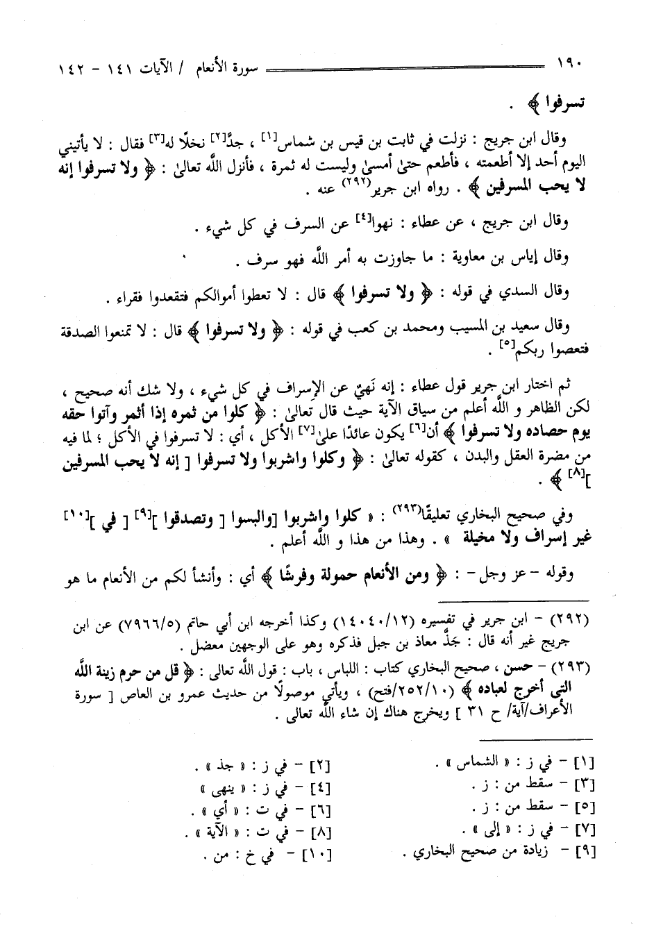 تُسْرِفُوا" وَقَالَ اِبْن جُرَيْج نَزَلَتْ فِي ثَابِت بْن قَيْس بْن شِمَاس جَذَّ نَخْلًا لَهُ فَقَالَ لَا يَأْتِينِي الْيَوْم أَحَد إِلَّا أَطْعَمْته فَأَطْعَمَ حَتَّى أَمْسَى وَلَيْسَتْ لَهُ ثَمَرَة فَأَنْزَلَ اللَّه تَعَالَى " وَلَا تُسْرِفُوا إِنَّهُ لَا يُحِبّ الْمُسْرِفِينَ " رَوَاهُ اِبْن جَرِير عَنْهُ وَقَالَ اِبْن جُرَيْج عَنْ عَطَاء نُهُوا عَنْ السَّرَف فِي كُلّ شَيْء وَقَالَ إِيَاس بْن مُعَاوِيَة : مَا جَاوَزْت بِهِ أَمْر اللَّه فَهُوَ سَرَف وَقَالَ السُّدِّيّ فِي قَوْله " وَلَا تُسْرِفُوا " قَالَ لَا تُعْطُوا أَمْوَالكُمْ فَتَقْعُدُوا فُقَرَاء.