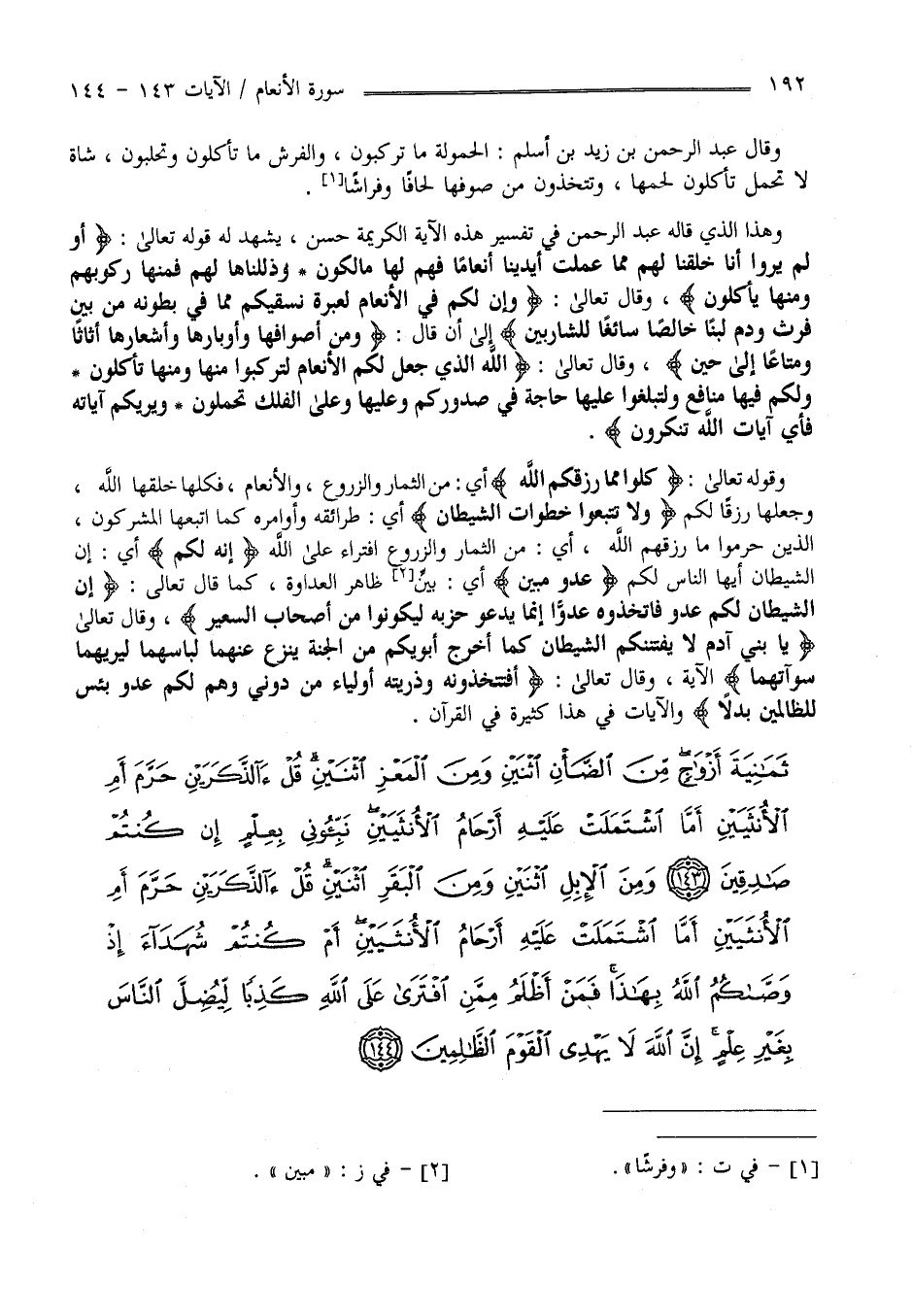 وَهَذَا الَّذِي قَالَ عَبْد الرَّحْمَن فِي تَفْسِير هَذِهِ الْآيَة الْكَرِيمَة حَسَن يَشْهَد لَهُ قَوْله تَعَالَى " أَوَلَمْ يَرَوْا أَنَّا خَلْقنَا لَهُمْ مِمَّا عَمِلَتْ أَيْدِينَا أَنْعَامًا فَهُمْ لَهَا مَالِكُونَ وَذَلَّلْنَاهَا لَهُمْ فَمِنْهَا رَكُوبهمْ وَمِنْهَا يَأْكُلُونَ " وَقَالَ تَعَالَى" وَإِنَّ لَكُمْ فِي الْأَنْعَام لَعِبْرَة نُسْقِيكُمْ مِمَّا فِي بُطُونه مِنْ بَيْن فَرْث وَدَم لَبَنًا خَالِصًا سَائِغًا لِلشَّارِبِينَ" إِلَى أَنْ قَالَ " وَمِنْ أَصْوَافهَا وَأَوْبَارهَا وَأَشْعَارهَا أَثَاثًا وَمَتَاعًا إِلَى حِين " وَقَالَ تَعَالَى " اللَّه الَّذِي جَعَلَ لَكُمْ الْأَنْعَام لِتَرْكَبُوا مِنْهَا وَمِنْهَا تَأْكُلُونَ وَلَكُمْ فِيهَا مَنَافِع وَلِتَبْلُغُوا عَلَيْهَا حَاجَة فِي صُدُوركُمْ وَعَلَيْهَا وَعَلَى الْفُلْك تُحْمَلُونَ وَيُرِيكُمْ آيَاته فَأَيّ آيَات اللَّه تُنْكِرُونَ " وَقَوْله تَعَالَى " كُلُوا مِمَّا رَزَقَكُمْ اللَّه " أَيْ مِنْ الثِّمَار وَالزُّرُوع وَالْأَنْعَام فَكُلّهَا خَلَقَهَا اللَّه وَجَعَلَهَا رِزْقًا لَكُمْ " وَلَا تَتَّبِعُوا خُطُوَات الشَّيْطَان" أَيْ طَرِيقه وَأَوَامِره كَمَا اِتَّبَعَهَا الْمُشْرِكُونَ الَّذِينَ حُرِمُوا مَا رَزَقَهُمْ اللَّه أَيْ مِنْ الثِّمَار وَالزُّرُوع اِفْتِرَاء عَلَى اللَّه " إِنَّهُ لَكُمْ " أَيْ إِنَّ الشَّيْطَان أَيّهَا النَّاس لَكُمْ " عَدُوّ مُبِين " أَيْ مُبِين ظَاهِر الْعَدَاوَة كَمَا قَالَ" إِنَّ الشَّيْطَان لَكُمْ عَدُوّ فَاِتَّخِذُوهُ عَدُوًّا إِنَّمَا يَدْعُو حِزْبه لِيَكُونُوا مِنْ أَصْحَاب السَّعِير " وَقَالَ تَعَالَى" يَا بَنِي آدَم لَا يَفْتِنَنكُمْ الشَّيْطَان كَمَا أَخْرَجَ أَبَوَيْكُمْ مِنْ الْجَنَّة يَنْزِع عَنْهُمَا لِبَاسهمَا لِيُرِيَهُمَا سَوْآتهمَا" الْآيَة وَقَالَ تَعَالَى " أَفَتَتَّخِذُونَهُ وَذُرِّيَّته أَوْلِيَاء مِنْ دُونِي وَهُمْ لَكُمْ عَدُوّ بِئْسَ لِلظَّالِمِينَ بَدَلًا " وَالْآيَات فِي هَذَا كَثِيرَة فِي الْقُرْآن .