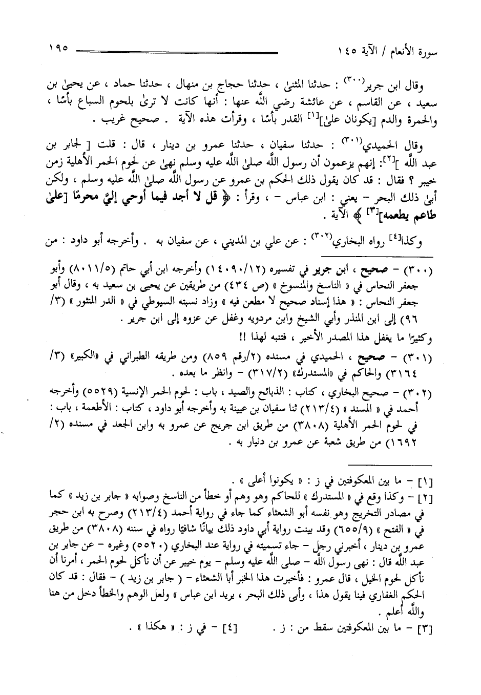 وَقَالَ اِبْن جَرِير : حَدَّثَنَا الْمُثَنَّى حَدَّثَنَا حَجَّاج بْن مِنْهَال حَدَّثَنَا حَمَّاد عَنْ يَحْيَى بْن سَعِيد عَنْ الْقَاسِم عَنْ عَائِشَة رَضِيَ اللَّه عَنْهَا أَنَّهَا كَانَتْ لَا تَرَى بِلُحُومِ السِّبَاع بَأْسًا وَالْحُمْرَة وَالدَّم يَكُونَانِ عَلَى الْقِدْر وَقَرَأْت هَذِهِ الْآيَة صَحِيح غَرِيب .