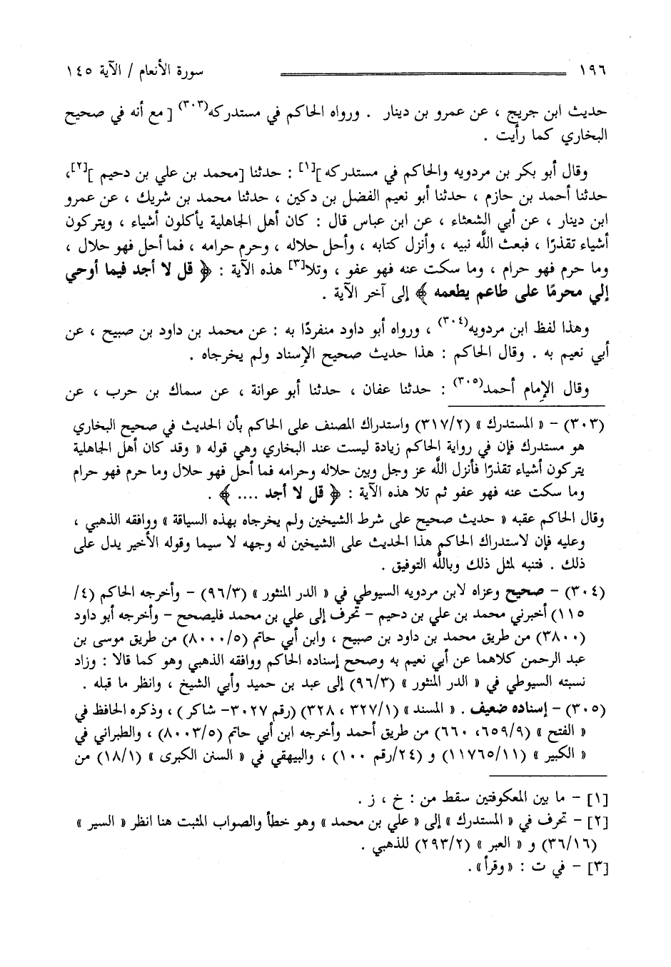 حَدِيث اِبْن جُرَيْج عَنْ عَمْرو بْن دِينَار وَرَوَاهُ الْحَاكِم فِي مُسْتَدْرَكه مَعَ أَنَّهُ فِي صَحِيح الْبُخَارِيّ كَمَا رَأَيْت وَقَالَ أَبُو بَكْر بْن مَرْدُوَيْهِ وَالْحَاكِم فِي مُسْتَدْرَكه : حَدَّثَنَا مُحَمَّد بْن عَلَى بْن دُحَيْم حَدَّثَنَا أَحْمَد بْن حَازِم حَدَّثَنَا أَبُو نُعَيْم الْفَضْل بْن دُكَيْن حَدَّثَنَا مُحَمَّد بْن شَرِيك عَنْ عَمْرو بْن دِينَار عَنْ أَبِي الشَّعْثَاء عَنْ اِبْن عَبَّاس قَالَ : كَانَ أَهْل الْجَاهِلِيَّة يَأْكُلُونَ أَشْيَاء وَيَتْرُكُونَ أَشْيَاء تَقَذُّرًا فَبَعَثَ اللَّه نَبِيّه وَأَنْزَلَ كِتَابه وَأَحَلَّ حَلَاله وَحَرَّمَ حَرَامه فَمَا أَحَلَّ فَهُوَ حَلَال وَمَا حَرَّمَ فَهُوَ حَرَام وَمَا سَكَتَ عَنْهُ فَهُوَ عَفْو وَقَرَأَ هَذِهِ الْآيَة" قُلْ لَا أَجِد فِيمَا أُوحِيَ إِلَيَّ مُحَرَّمًا عَلَى طَاعِم يَطْعَمهُ" الْآيَة وَهَذَا لَفْظ اِبْن مَرْدُوَيْهِ وَرَوَاهُ أَبُو دَاوُد مُنْفَرِدًا بِهِ عَنْ مُحَمَّد بْن دَاوُد بْن صُبَيْح عَنْ أَبِي نُعَيْم بِهِ وَقَالَ الْحَاكِم : هَذَا حَدِيث صَحِيح الْإِسْنَاد وَلَمْ يُخَرِّجَاهُ وَقَالَ الْإِمَام أَحْمَد : حَدَّثَنَا عَفَّان حَدَّثَنَا أَبُو عَوَانَة عَنْ سِمَاك بْن حَرْب