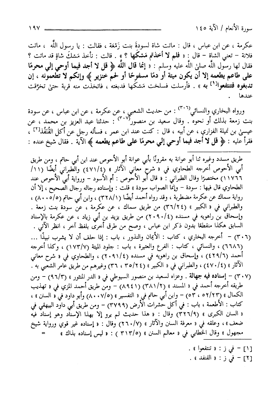 عِكْرِمَة عَنْ اِبْن عَبَّاس قَالَ : مَاتَتْ شَاة لِسَوْدَةَ بِنْت زَمْعَة فَقَالَتْ : يَا رَسُول اللَّه مَاتَتْ فُلَانَة تَعْنِي الشَّاة قَالَ " فَلِمَ لَا أَخَذْتُمْ مِسْكهَا " قَالَتْ نَأْخُذ مِسْك شَاة قَدْ مَاتَتْ ؟ فَقَالَ لَهَا رَسُول اللَّه صَلَّى اللَّه عَلَيْهِ وَسَلَّمَ " إِنَّمَا قَالَ اللَّه " قُلْ لَا أَجِد فِيمَا أُوحِيَ إِلَيَّ مُحَرَّمًا عَلَى طَاعِم يَطْعَمهُ إِلَّا أَنْ يَكُون مَيْتَة أَوْ دَمًا مَسْفُوحًا أَوْ لَحْم خِنْزِير " وَإِنَّكُمْ لَا تُطْعِمُونَهُ إِنْ تَدْبُغُوهُ فَتَنْتَفِعُوا بِهِ فَأَرْسَلَتْ فَسَلَخَتْ مَسْكهَا فَاتَّخَذَتْ مِنْهُ قِرْبَة حَتَّى تَخَرَّقَتْ عِنْدهَا رَوَاهُ أَحْمَد وَرَوَاهُ الْبُخَارِيّ وَالنَّسَائِيّ مِنْ حَدِيث الشَّعْبِيّ عَنْ عِكْرِمَة عَنْ اِبْن عَبَّاس عَنْ سَوْدَة بِنْت زَمْعَة بِذَلِكَ أَوْ نَحْوه وَقَالَ سَعِيد بْن مَنْصُور : حَدَّثَنَا عَبْد الْعَزِيز بْن مُحَمَّد عَنْ عِيسَى بْن نُمَيْلَة الْفَزَارِيّ عَنْ أَبِيهِ قَالَ : كُنْت عِنْد اِبْن عُمَر فَسَأَلَهُ رَجُل عَنْ أَكْل الْقُنْفُذ فَقَرَأَ عَلَيْهِ " قُلْ لَا أَجِد فِيمَا أُوحِيَ إِلَيَّ مُحَرَّم عَلَى طَاعِم يَطْعَمهُ " الْآيَة فَقَالَ شَيْخ عِنْده
