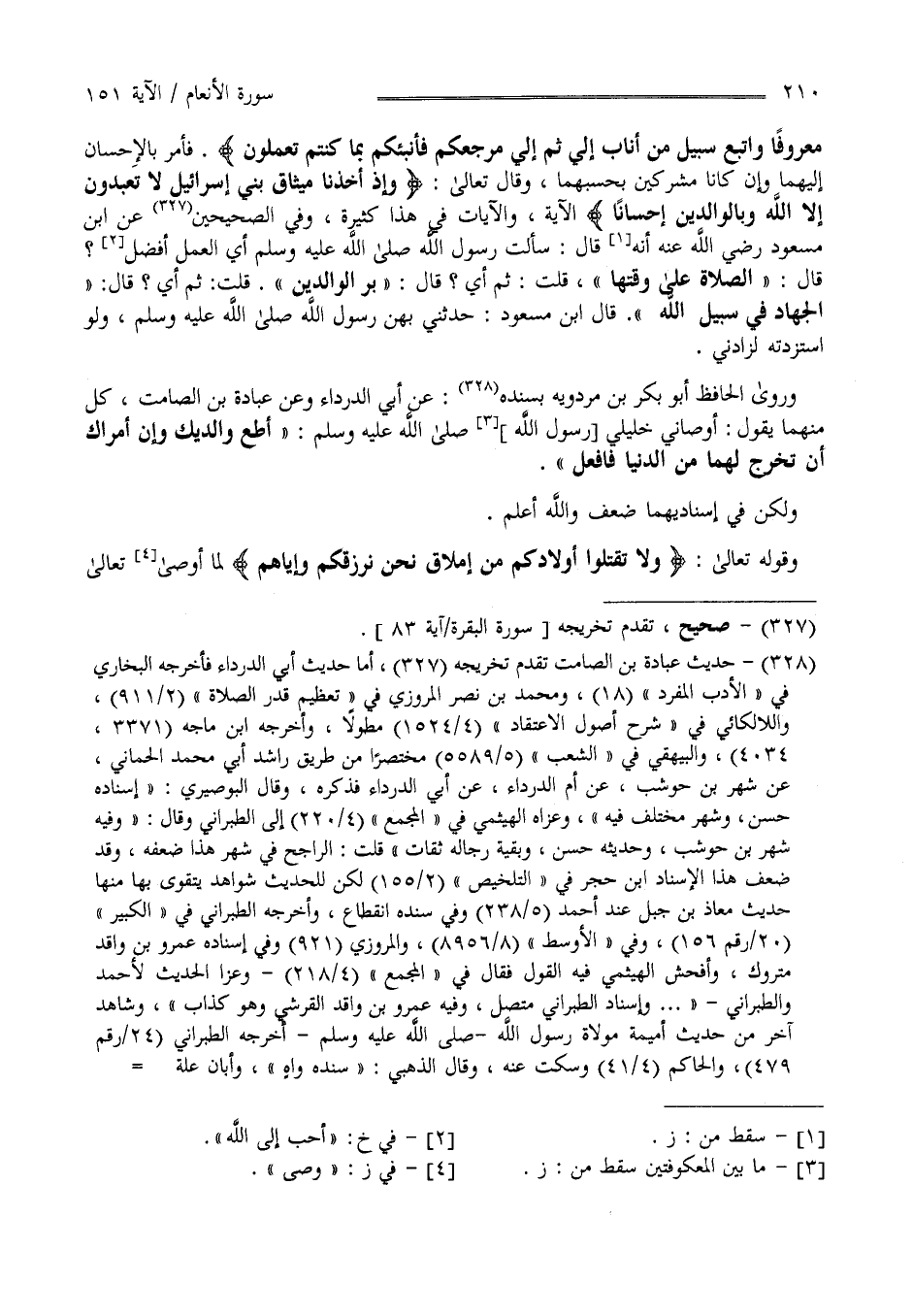 إِسْرَائِيل لَا تَعْبُدُونَ إِلَّا اللَّه وَبِالْوَالِدَيْنِ إِحْسَانًا " الْآيَة وَالْآيَات فِي هَذَا كَثِيرَة وَفِي الصَّحِيحَيْنِ عَنْ اِبْن مَسْعُود رَضِيَ اللَّه عَنْهُ أَنَّهُ قَالَ : سَأَلْت رَسُول اللَّه صَلَّى اللَّه عَلَيْهِ وَسَلَّمَ أَيّ الْعَمَل أَفْضَل ؟ قَالَ الصَّلَاة عَلَى وَقْتهَا قُلْت ثُمَّ أَيّ ؟ قُلْ بِرّ الْوَالِدَيْنِ قُلْت ثُمَّ أَيّ ؟ قَالَ الْجِهَاد فِي سَبِيل اللَّه قَالَ اِبْن مَسْعُود : حَدَّثَنِي بِهِنَّ رَسُول اللَّه صَلَّى اللَّه عَلَيْهِ وَسَلَّمَ وَلَوْ اِسْتَزَدْته لَزَادَنِي وَرَوَى الْحَافِظ أَبُو بَكْر بْن مَرْدُوَيْهِ بِسَنَدِهِ عَنْ أَبِي الدَّرْدَاء وَعَنْ عُبَادَة بْن الصَّامِت كُلّ مِنْهُمَا يَقُول أَوْصَانِي خَلِيلِي رَسُول اللَّه صَلَّى اللَّه عَلَيْهِ وَسَلَّمَ أَطِعْ وَالِدَيْك وَإِنْ أَمَرَاك أَنْ تَخْرُج لَهُمَا مِنْ الدُّنْيَا فَافْعَلْ وَلَكِنْ فِي إِسْنَادَيْهِمَا ضَعْف وَاَللَّه أَعْلَم .