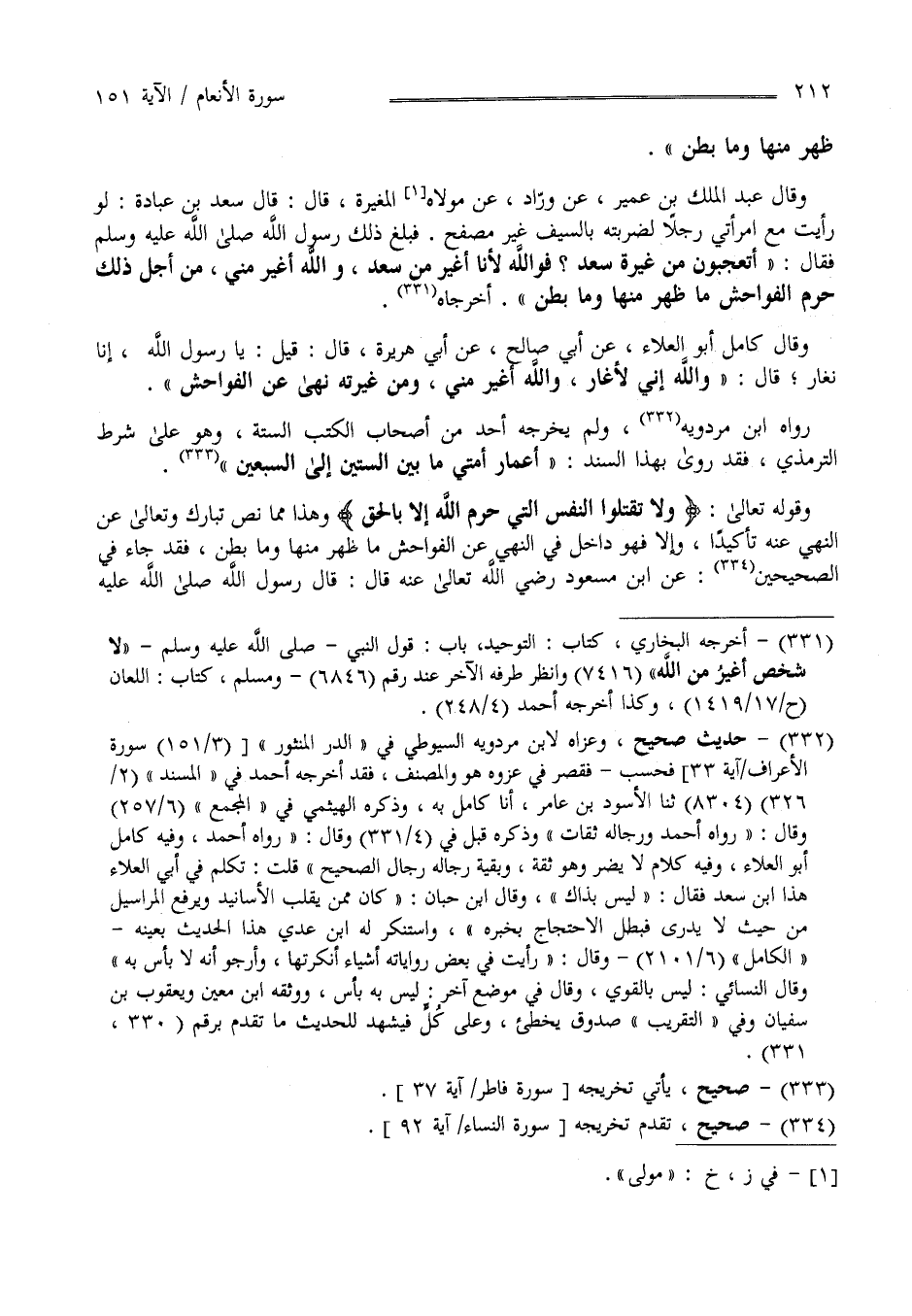 ظَهَرَ مِنْهَا وَمَا بَطَنَ وَقَالَ عَبْد الْمَلِك بْن عُمَيْر عَنْ وَرَّاد عَنْ مَوْلَاهُ الْمُغِيرَة قَالَ : قَالَ سَعْد بْن عُبَادَة لَوْ رَأَيْت مَعَ اِمْرَأَتِي رَجُلًا لَضَرَبْته بِالسَّيْفِ غَيْر مُصَفَّح فَبَلَغَ ذَلِكَ رَسُول اللَّه صَلَّى اللَّه عَلَيْهِ وَسَلَّمَ فَقَالَ أَتَعْجَبُونَ مِنْ غَيْرَة سَعْد ؟ فَوَاَللَّهِ لَأَنَا أَغْيَر مِنْ سَعْد وَاَللَّه أَغْيَر مِنِّي مِنْ أَجْل ذَلِكَ حَرَّمَ الْفَوَاحِش مَا ظَهَرَ مِنْهَا وَمَا بَطَنَ أَخْرَجَاهُ وَقَالَ كَامِل أَبُو الْعَلَاء عَنْ أَبِي صَالِح عَنْ أَبِي هُرَيْرَة قَالَ : قِيلَ يَا رَسُول اللَّه إِنَّا نَغَار قَالَ وَاَللَّه إِنِّي لَأَغَار وَاَللَّه أَغْيَر مِنِّي وَمِنْ غَيْرَته نَهَى عَنْ الْفَوَاحِش رَوَاهُ اِبْن مَرْدُوَيْهِ وَلَمْ يُخْرِجهُ أَحَد مِنْ أَصْحَاب الْكُتُب السِّتَّة وَمَرَّ عَلَى شَرْط التِّرْمِذِيّ فَقَدْ رُوِيَ بِهَذَا السَّنَد أَعْمَار أُمَّتِي مَا بَيْن السِّتِّينَ إِلَى السَّبْعِينَ وَقَوْله تَعَالَى" وَلَا تَقْتُلُوا النَّفْس الَّتِي حَرَّمَ اللَّه إِلَّا بِالْحَقِّ" وَهَذَا مِمَّا نَصَّ تَبَارَكَ وَتَعَالَى عَنْ النَّهْي عَنْهُ تَأْكِيدًا وَإِلَّا فَهُوَ دَاخِل فِي النَّهْي عَنْ الْفَوَاحِش مَا ظَهَرَ مِنْهَا وَمَا بَطَنَ فَقَدْ جَاءَ فِي الصَّحِيحَيْنِ عَنْ اِبْن مَسْعُود رَضِيَ اللَّه تَعَالَى عَنْهُ قَالَ :قَالَ رَسُول اللَّه صَلَّى اللَّه عَلَيْه