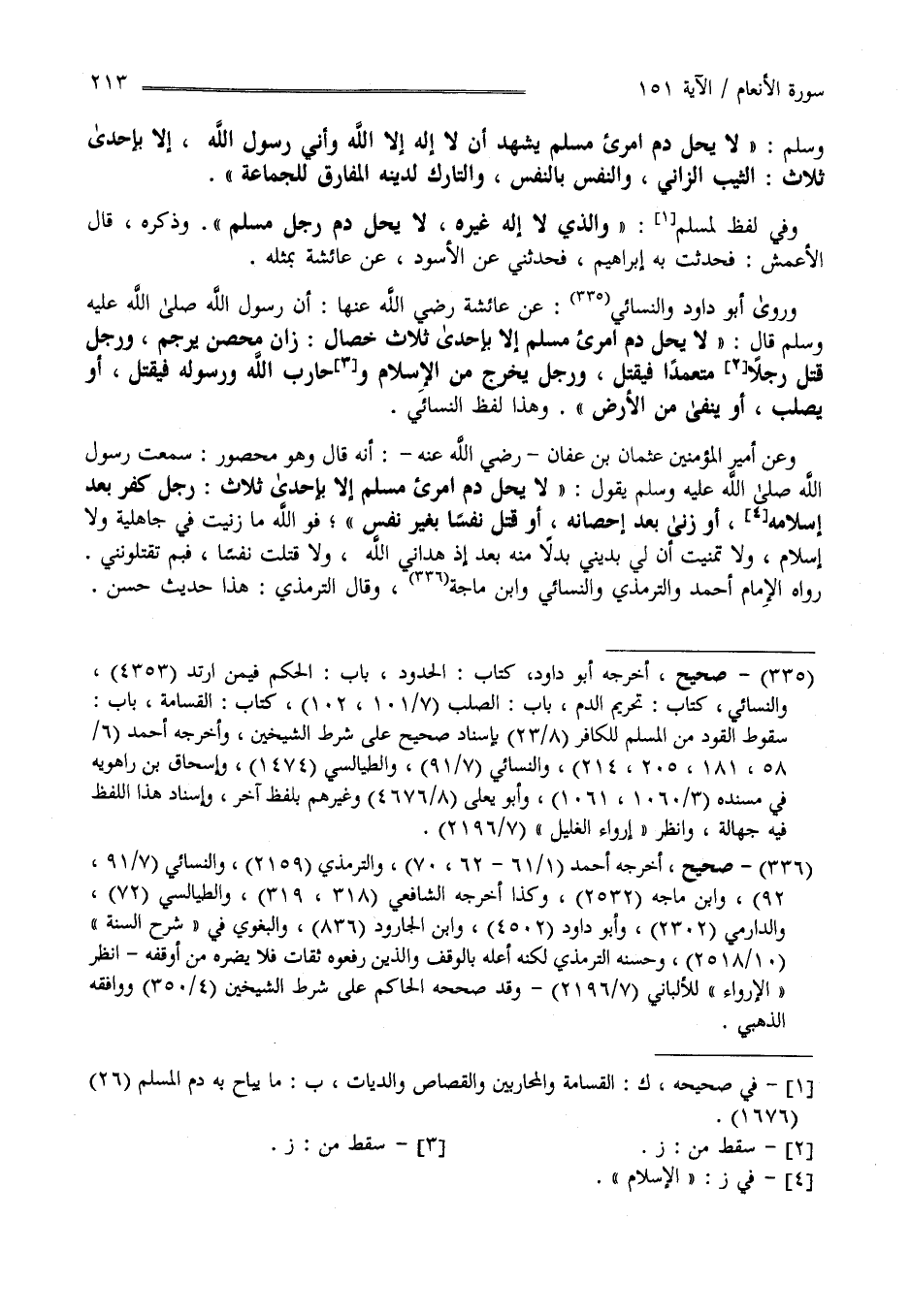 وَسَلَّمَ لَا يَحِلّ دَم اِمْرِئٍ مُسْلِم يَشْهَد أَنْ لَا إِلَه إِلَّا اللَّه وَأَنِّي رَسُول اللَّه إِلَّا بِإِحْدَى ثَلَاث الثَّيِّب الزَّانِي وَالنَّفْس بِالنَّفْسِ وَالتَّارِك لِدِينِهِ الْمُفَارِق لِلْجَمَاعَةِ وَفِي لَفْظ لِمُسْلِمٍ وَاَلَّذِي لَا إِلَه غَيْره لَا يَحِلّ دَم رَجُل مُسْلِم وَذَكَرَهُ قَالَ الْأَعْمَش فَحَدَّثْت بِهِ إِبْرَاهِيم فَحَدَّثَنِي عَنْ الْأَسْوَد عَنْ عَائِشَة بِمِثْلِهِ وَرَوَى أَبُو دَاوُد وَالنَّسَائِيّ عَنْ عَائِشَة رَضِيَ اللَّه عَنْهَا أَنَّ رَسُول اللَّه صَلَّى اللَّه عَلَيْهِ وَسَلَّمَ قَالَ لَا يَحِلّ دَم اِمْرِئٍ مُسْلِم إِلَّا بِإِحْدَى ثَلَاث خِصَال زَانٍ مُحْصَن يُرْجَم وَرَجُل قَتَلَ مُتَعَمِّدًا فَيُقْتَل وَرَجُل