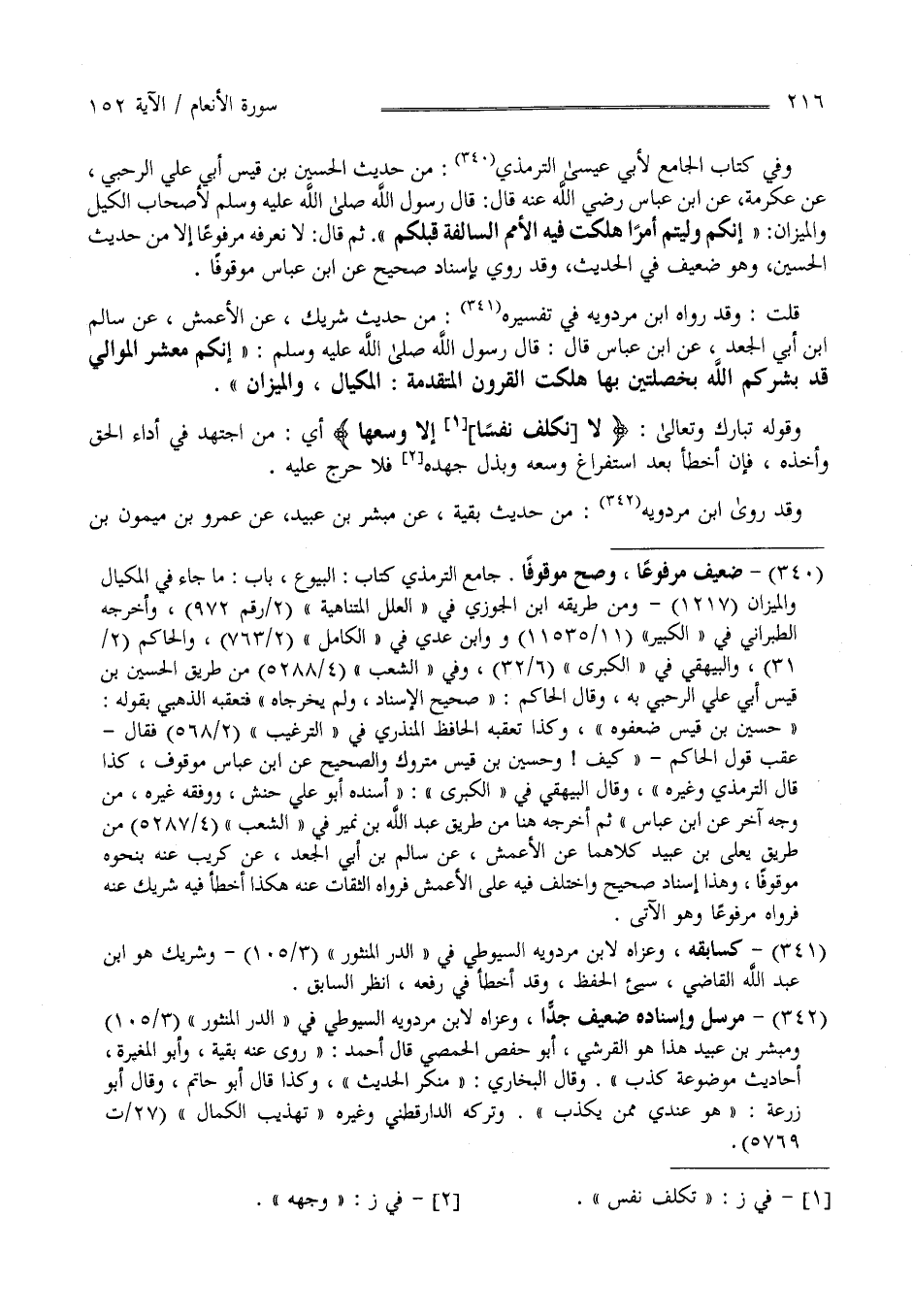 وَقَدْ رُوِيَ بِإِسْنَادٍ صَحِيح عَنْ اِبْن عَبَّاس مَوْقُوفًا قُلْت وَقَدْ رَوَاهُ اِبْن مَرْدُوَيْهِ فِي تَفْسِيره مِنْ حَدِيث شَرِيك عَنْ الْأَعْمَش عَنْ سَالِم بْن أَبِي الْجَعْد عَنْ اِبْن عَبَّاس قَالَ : قَالَ رَسُول اللَّه صَلَّى اللَّه عَلَيْهِ وَسَلَّمَ إِنَّكُمْ مَعْشَر الْمَوَالِي قَدْ بَشَّرَكُمْ اللَّه بِخَصْلَتَيْنِ بِهَا هَلَكَتْ الْقُرُون الْمُتَقَدِّمَة الْمِكْيَال وَالْمِيزَان وَقَوْله تَبَارَكَ وَتَعَالَى " لَا نُكَلِّف نَفْسًا إِلَّا وُسْعهَا " أَيْ مَنْ اِجْتَهَدَ فِي أَدَاء الْحَقّ وَأَخَذَهُ فَإِنْ أَخْطَأَ بَعْد اِسْتِفْرَاغ وُسْعه وَبَذْل جَهْده فَلَا حَرَج عَلَيْهِ .