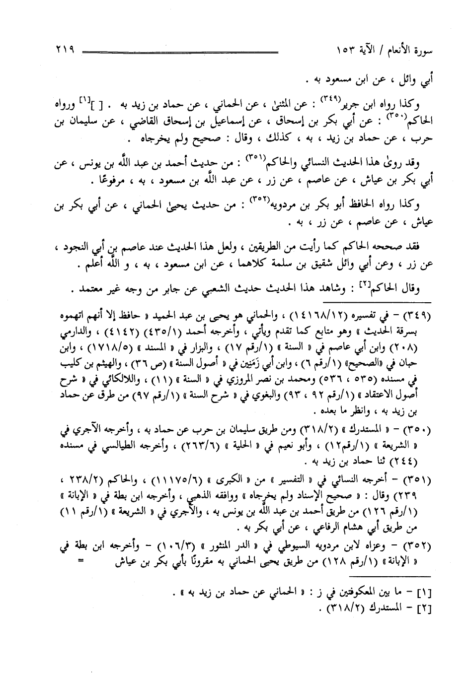 أَبِي وَائِل عَنْ اِبْن مَسْعُود بِهِ وَكَذَا رَوَاهُ اِبْن جَرِير عَنْ الْمُثَنَّى عَنْ الْحِمَّانِيّ عَنْ حَمَّاد بْن زَيْد بِهِ وَرَوَاهُ الْحَاكِم عَنْ أَبِي بَكْر بْن إِسْحَاق عَنْ إِسْمَاعِيل بْن إِسْحَاق الْقَاضِي عَنْ سُلَيْمَان بْن حَرْب عَنْ حَمَّاد بْن زَيْد بِهِ كَذَلِكَ وَقَالَ صَحِيح وَلَمْ يُخَرِّجَاهُ وَقَدْ رَوَى هَذَا الْحَدِيث النَّسَائِيّ وَالْحَاكِم مِنْ حَدِيث أَحْمَد بْن عَبْد اللَّه بْن يُونُس عَنْ أَبِي بَكْر بْن عَيَّاش عَنْ عَاصِم عَنْ زِرّ عَنْ عَبْد اللَّه بْن مَسْعُود بِهِ مَرْفُوعًا وَكَذَا رَوَاهُ الْحَافِظ أَبُو بَكْر بْن مَرْدُوَيْهِ مِنْ حَدِيث يَحْيَى الْحِمَّانِيّ عَنْ أَبِي بَكْر بْن عَيَّاش عَنْ عَاصِم عَنْ زِرّ بِهِ فَقَدْ صَحَّحَهُ الْحَاكِم كَمَا رَأَيْت فِي الطَّرِيقَيْنِ وَلَعَلَّ هَذَا الْحَدِيث عَنْ عَاصِم بْن أَبِي النَّجُود عَنْ زِرّ وَعَنْ أَبِي وَائِل شَقِيق بْن سَلَمَة كِلَاهُمَا عَنْ اِبْن مَسْعُود بِهِ وَاَللَّه أَعْلَم وَقَالَ الْحَاكِم : وَشَاهِد هَذَا الْحَدِيث حَدِيث الشَّعْبِيّ عَنْ جَابِر مِنْ غَيْر وَجْه مُعْتَمَد.