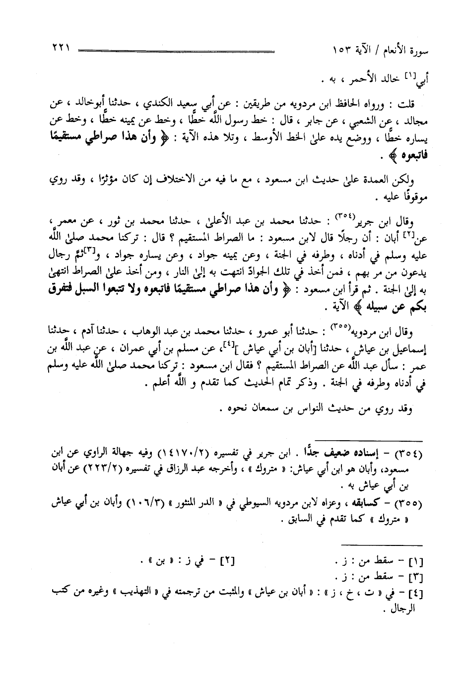 أَبِي خَالِد الْأَحْمَر بِهِ قُلْت وَرَوَاهُ الْحَافِظ اِبْن مَرْدُوَيْهِ مِنْ طَرِيقَيْنِ عَنْ أَبِي سَعِيد الْكِنْدِيّ حَدَّثَنَا أَبُو خَالِد عَنْ مُجَاهِد عَنْ الشَّعْبِيّ عَنْ جَابِر قَالَ : خَطَّ رَسُول اللَّه صَلَّى اللَّه عَلَيْهِ وَسَلَّمَ خَطًّا وَخَطَّ عَنْ يَمِينه خَطًّا وَخَطَّ عَنْ يَسَاره خَطًّا وَوَضَعَ يَده عَلَى الْخَطّ الْأَوْسَط وَتَلَا هَذِهِ الْآيَة " وَأَنَّ هَذَا صِرَاطِي مُسْتَقِيمًا فَاتَّبِعُوهُ " وَلَكِنَّ الْعُمْدَة عَلَى حَدِيث اِبْن مَسْعُود مَعَ مَا فِيهِ مِنْ الِاخْتِلَاف إِنْ كَانَ مُؤَثِّرًا وَقَدْ رُوِيَ مَوْقُوفًا عَلَيْهِ قَالَ اِبْن جَرِير : حَدَّثَنَا مُحَمَّد بْن عَبْد الْأَعْلَى حَدَّثَنَا مُحَمَّد بْن ثَوْر عَنْ مَعْمَر عَنْ أَبَان بْن عُثْمَان أَنَّ رَجُلًا قَالَ لِابْنِ مَسْعُود مَا الصِّرَاط الْمُسْتَقِيم ؟ قَالَ : تَرَكْنَا مُحَمَّد صَلَّى اللَّه عَلَيْهِ وَسَلَّمَ فِي أَدْنَاهُ وَطَرَفه فِي الْجَنَّة وَعَنْ يَمِينه جَوَاد وَعَنْ يَسَاره جَوَاد ثُمَّ رِجَال يَدْعُونَ مَنْ مَرَّ بِهِمْ فَمَنْ أَخَذَ فِي تِلْكَ الْجَوَاد اِنْتَهَتْ بِهِ إِلَى النَّار وَمَنْ أَخَذَ عَلَى الصِّرَاط اِنْتَهَى بِهِ إِلَى الْجَنَّة .