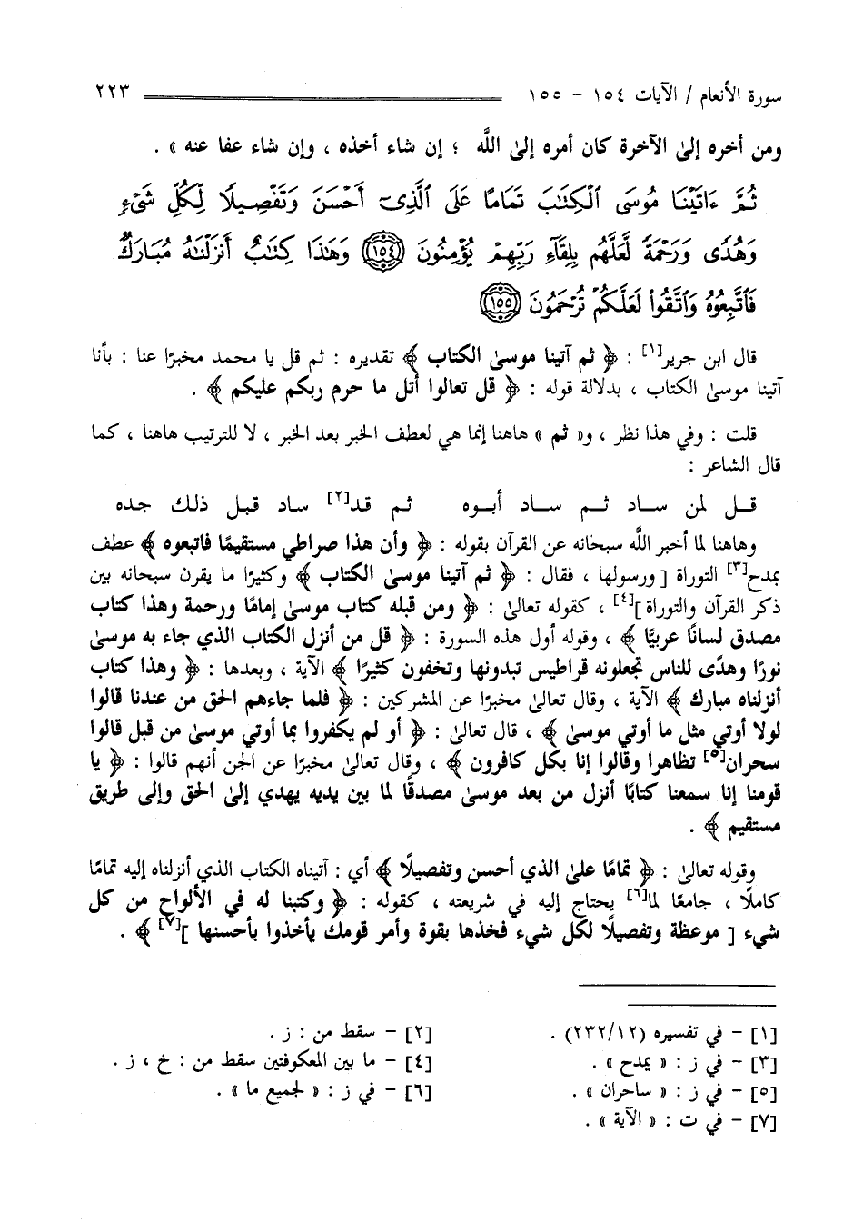 قَالَ اِبْن جَرِير " ثُمَّ آتَيْنَا مُوسَى الْكِتَاب " تَقْدِيره ثُمَّ قُلْ يَا مُحَمَّد مُخْبِرًا عَنَّا أَنَّا آتَيْنَا مُوسَى الْكِتَاب بِدَلَالَةِ قَوْله " قُلْ تَعَالَوْا أَتْلُ مَا حَرَّمَ رَبّكُمْ عَلَيْكُمْ" قُلْت وَفِي هَذَا نَظَر , وَ " ثُمَّ " هَهُنَا إِنَّمَا هِيَ لِعَطْفِ الْخَبَر بَعْد الْخَبَر لَا لِلتَّرْتِيبِ هَهُنَا كَمَا قَالَ الشَّاعِر :